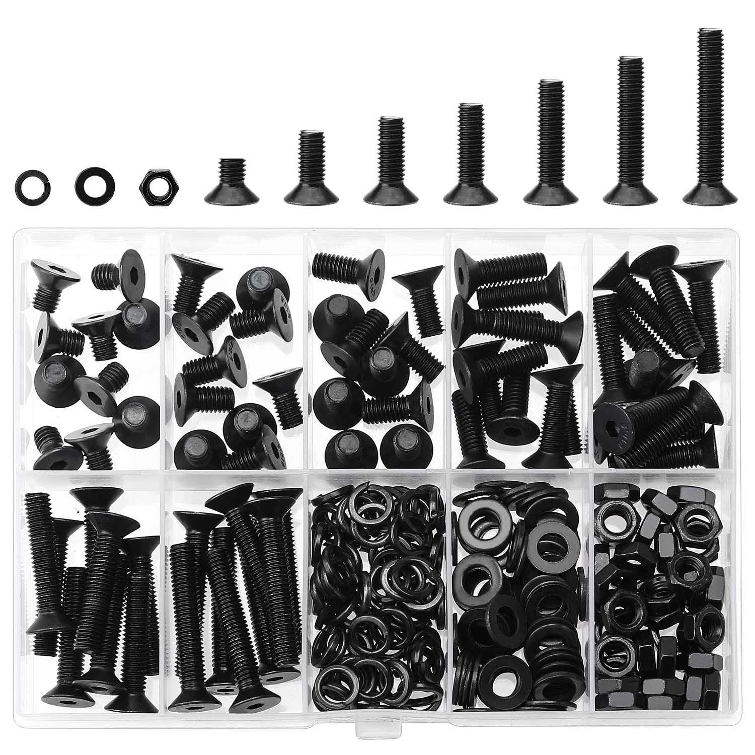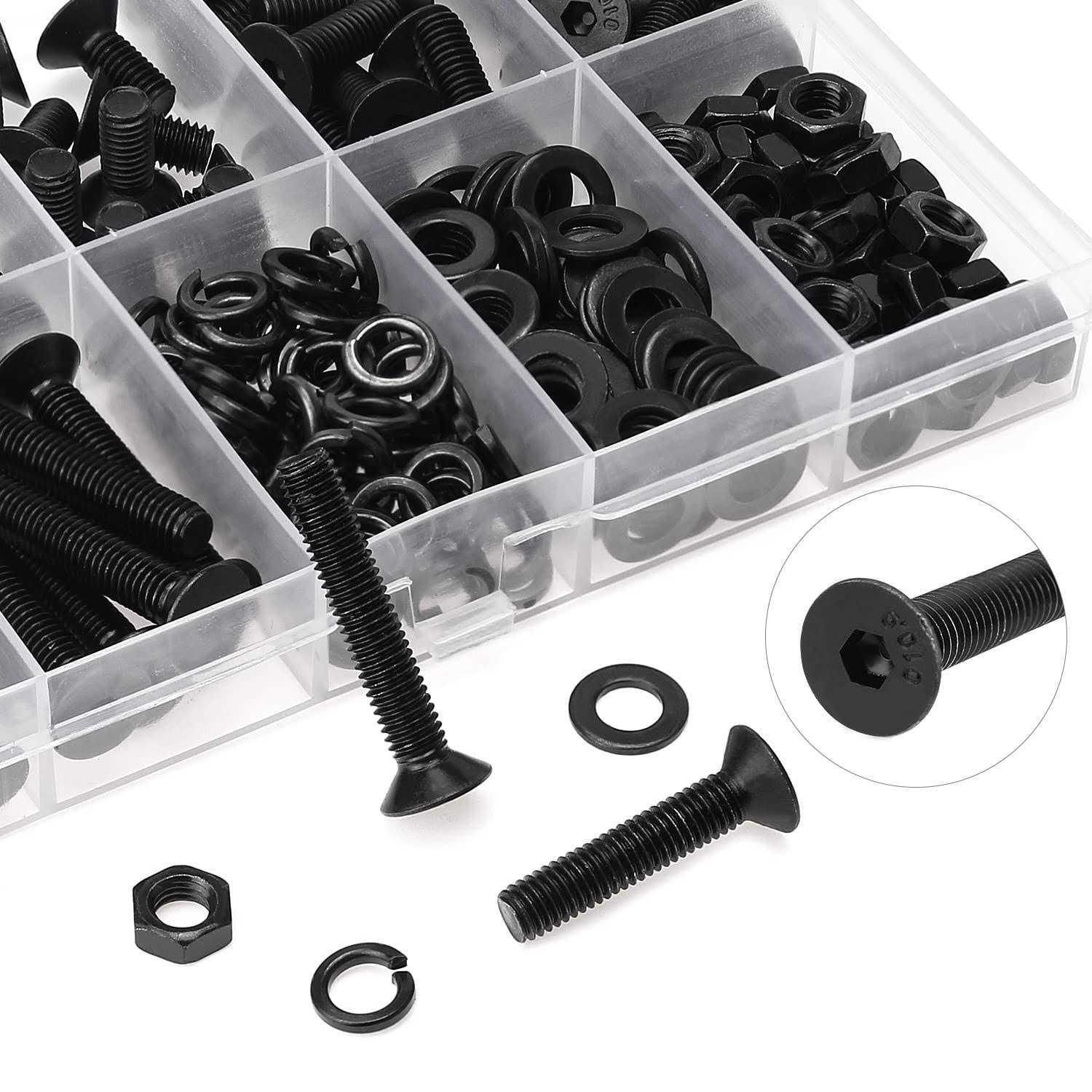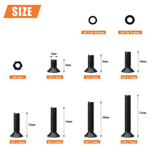 【Sizes】M5 x 6mm /8mm /10mm /12mm /16mm /20mm /25mm countersunk head socket cap screws with matching hex nuts, lock washers and flat washers, total 7 sizes, different sizes can meet your different needs. 【Material】Made of high quality 10.9 grade alloy steel and the surface is treated with black oxide, high hardness, no deformation, anti-oxidation, wear resistance, corrosion resistance, which can ensure long time using. 【Package】240 pieces in total, packed in a durable transparent box with label. It is easy to distinguish the size of the product, when you want to use a certain screw, you don’t have to waste time buying it separately, you can choose the suitable one to meet all your needs. 【Wide Applications】Widely used in all kinds of precision machinery industry, classified instruments, instruments, electronic products, printed projects, household appliances, communication products, locks, lamps, lights, toys, etc. 【Tips】Products contain small parts, keep away from children and prevent inadvertent swallowed. All screws are special sharp with screw thread, please keep away from kids.