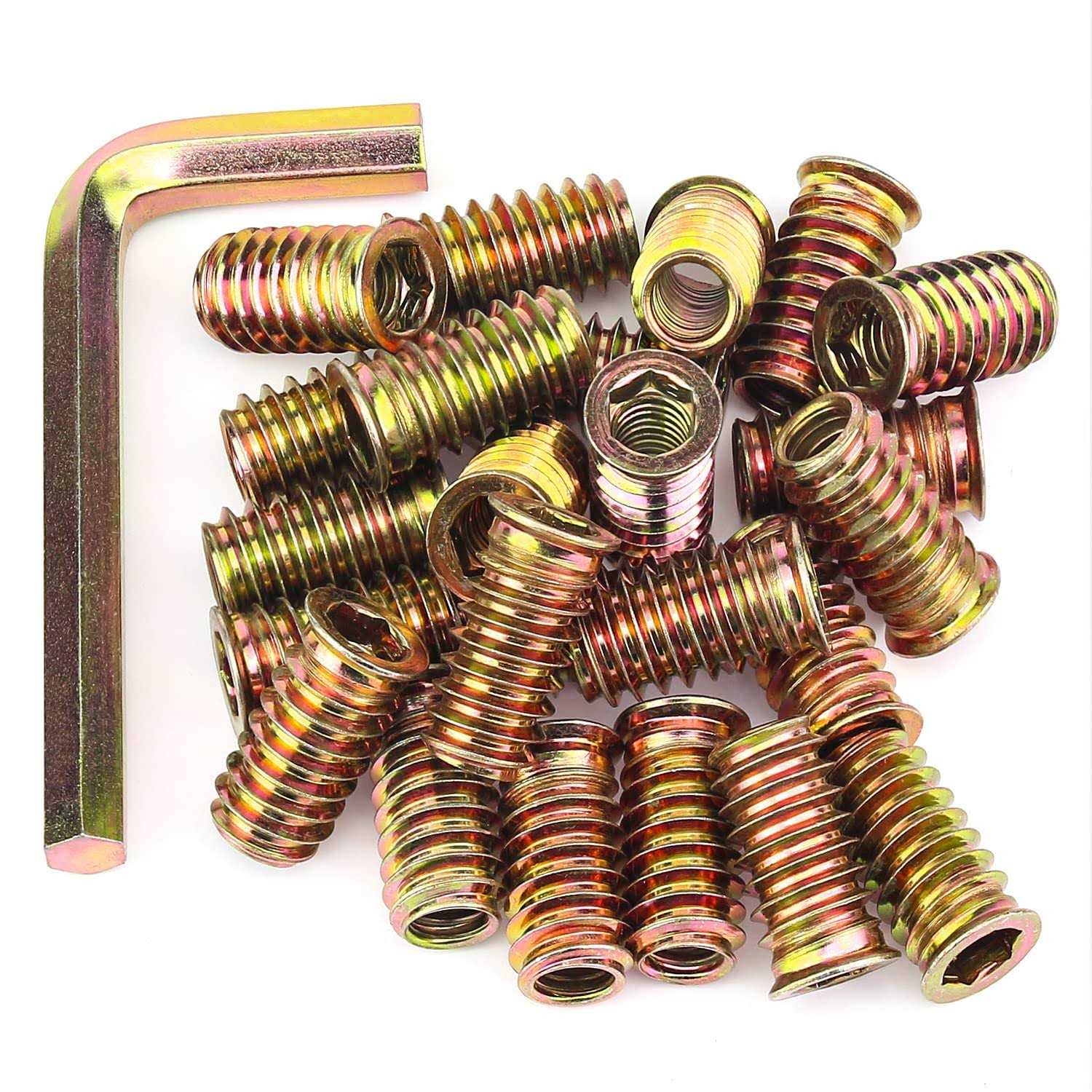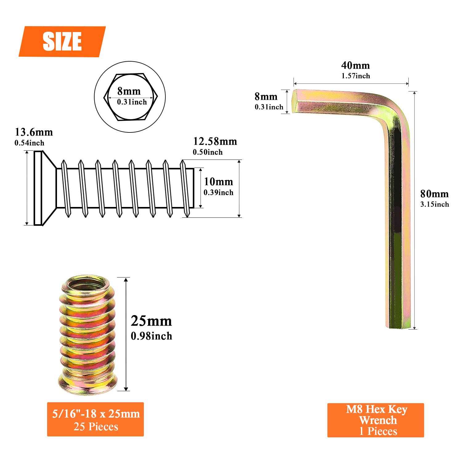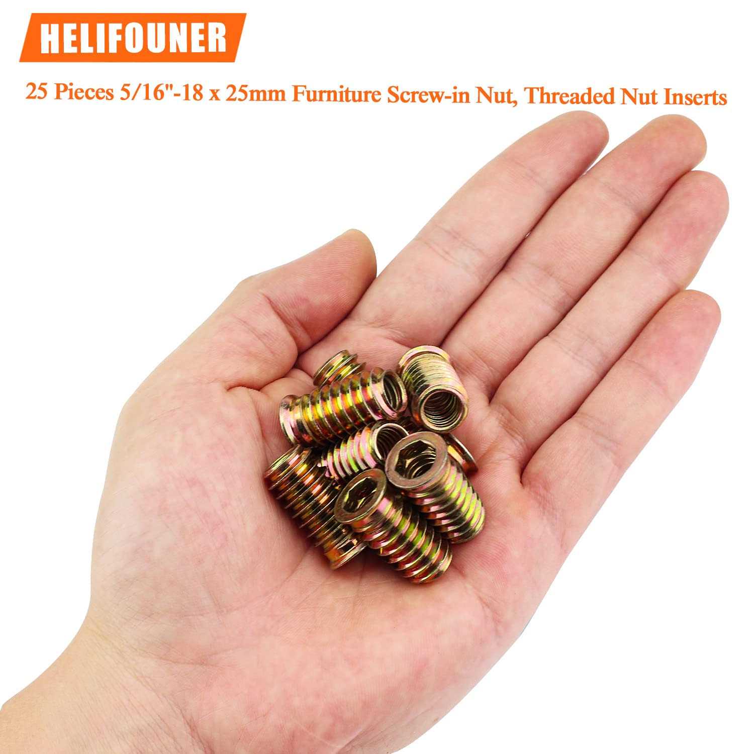 【Detailed Dimensions】5/16”-18 x 25mm, commonly used threaded inserts, can satisfy your daily time use. Internal thread insert type: 5/16”-18, thread type: 18 threads per inch, coarse thread, fit standard 5/16 18 screws bolts perfectly. 【Color Zinc Plated Steel】Made of high quality carbon steel, color zinc plated on the surface which have good corrosion resistance in bad environment like high temperature, high hardness and perfect wear resistance, standard internal hex socket, without burr, smooth, non-slip, which can ensure long time using. 【Easy To Install】You can drill a hole by using a 12mm drill bit, ensure a precise 90 degree angle for inserting the threaded inserts, then you need to screw the inserts into the 12mm holes by using our hex wrench. Make sure you countersink the hole to head size before you insert the threaded sleeve, fit standard 5/16 18 screws bolts perfectly. 【Threaded Inserts Package Include】 Total 25 pieces 5/16-18 x 25mm threaded inserts are packed in an environment-friendly cardboard box, enough quantities can satisfy your long time using. Our threaded inserts have standard internal hex socket, without burr, smooth, non-slip, wear resistance and very practical. 【Wide Applications】You can use our threaded inserts to repair file cabinets and chair leg, you can also use them on head board and foot board of wood furniture. Widely used for soft woods of pine, plywood, fiberboard, etc, work perfectly on the furniture combination, you just need to drill a hole that the size of the body into the wood for the threaded inserts. br 【Specifications:】 /b br – Thread Type: 5/16”-18 br – Sizes: 5/16”-18 x 25mm br – Package Quantity: 25 Pieces br – Color: Color zinc, as picture show br – Fit for standard 5/16 18 screws bolts br – Type: 5/16-18 Wood Threaded Inserts br – Material: High Quality Zinc Plated Carbon Steel br br 【Features:】 /b br – Material: Made of high quality carbon steel, color zinc plated on the surface which have good corrosion resistance in bad environment like high temperature, high hardness and perfect wear resistance, standard internal hex socket, without burr, smooth, non-slip, which can ensure long time using. br – Easy to install, HELIFOUNER threaded Inserts are best for composite materials, soft wood, plywood and hardwood, you can drill a hole by using a 12mm drill bit, ensure a precise 90 degree angle for inserting the threaded inserts, then you need to screw the inserts into the 12mm holes by using our hex wrench. br – Total 25 pieces 5/16-18 x 25mm threaded inserts are packed in an environment-friendly cardboard box, enough quantities can satisfy your long time using. Our threaded inserts have standard internal hex socket, without burr, smooth, non-slip, widely used for all kinds of composite materials, soft wood, plywood and hardwood. br br 【Package Included:】 /b br 5/16”-18 x 25mm ——–25 Pieces br 8mm Hex Wrench ——–1 Pieces br br 【Total Quantity: 25 Pieces 5/16”-18 x 25mm Threaded Inserts】 /b br br 【Tips:】 /b br 1.