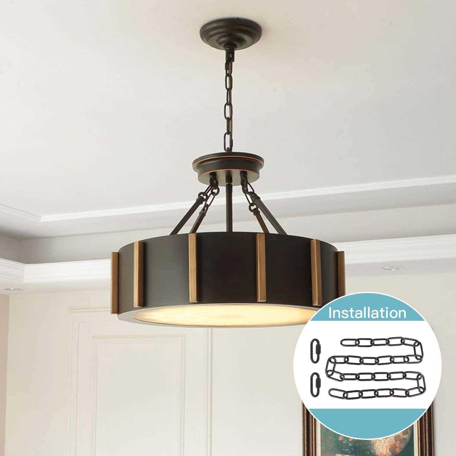 Product Description:The lighting chain is suitable for chandelier, ceiling light, hanging light fixture, and hanging fruit baskets or flower pots.It works with flat, sloping, slanted and vaulted ceilings, and is perfect with all DIY chandelier project. Specifications:? Chain length: 6 feet oval chain? Diameter of connection lock: =1/8??? max load: 50 lbs? Material: high quality metal + finish coat?