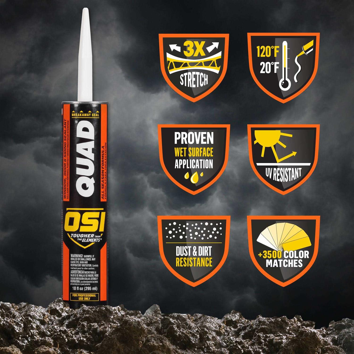 OSI Quad Window, Door & Siding Sealant is an all season formula designed for superior performance on exterior window, door, siding applications, PVC trim, roofing and gutters. Bonds without a primer to most common substrates like cedar, painted or stained woods, fiberglass, vinyl, coated aluminum, steel, metal, brick, masonry, and concrete. It can be applied to wet or dry surfaces, even at freezing temperatures. Unlike other sealants, it resists dirt & dust collection, yellowing and water washout. OSI QUAD is self-tooling and once cured is paintable with latex paints. Our color specialists work closely with leading window, door and siding manufacturers to ensure perfect color matches. OSI QUAD is composed of elastomeric polymers and high quality synthetic resins. This product offers the superior adhesion characteristics and unmatched elasticity found in high performance sealants. It yields a tough, rubbery seal which resists outdoor weather-related elements. The formula skins over in a short time to resist dirt and dust pickup. It goes on smoothly and has easy cut-off without stringing. 24 month shelf life from date of manufacture – unopened.