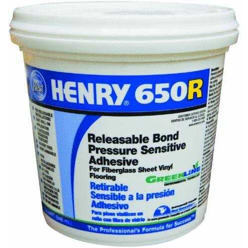 Henry 650R Releasable is a premium pressure-sensitive adhesive with releasable bonding properties that firmly adhere the floor yet enable easy removal of the flooring at any time with no damage to the subfloor. Henry 650R Releasable is ideal for reducing the remodel workload in rental units condominiums or other spaces which undergo frequent replacement of the floor covering. An excellent alternative to loose-lay installation when flooring manufacturer quidelines permit adhesive use. Bonds to concrete cementitious underlayments suspended APA grade underlayment plywood radiant heat subfloors where temperatures do not exceed 85 degrees terrazzo and fully adhered noncushion-backed resilient on all grade levels. Can also be used over properly primed gypsum underlayments above grade only. Solvent-free nonflammable plasticizer migration-resistant. Tool recommendations: U-notch trowel 1/32″ D. x 1/16″ W. x 1/32″ A. and short nap roller 3/16″ to 3/8″. Wet residue can be removed with a clean white cloth dampened with soapy water. Mineral spirits will remove dried adhesive residue.