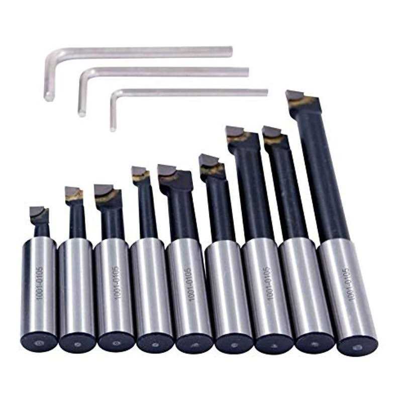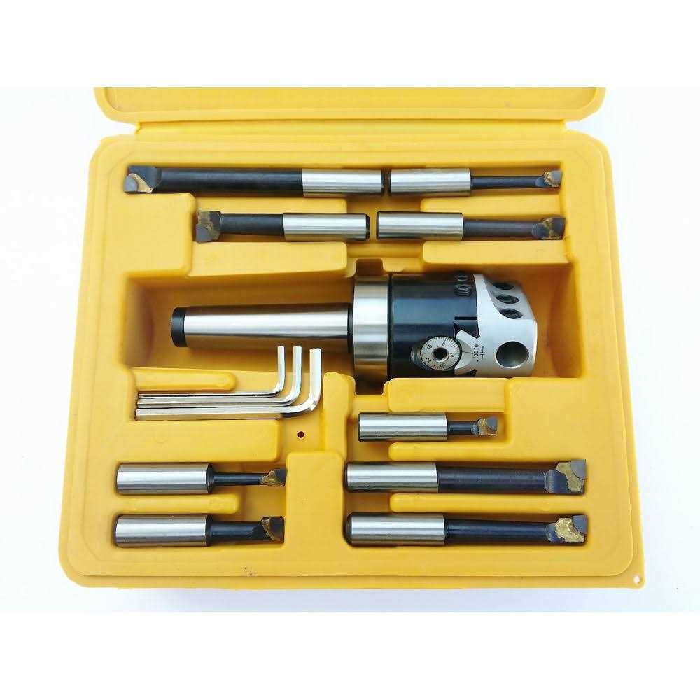 HHIP 1001-0105 3 Piece Boring Tool Set (2 Inch Head & MT3 & 1/2 Inch)3MT Boring Tool Set ~ Includes a 2′ Head. an 3MT Shank. and a 1/2′ 9 Piece Boring Bar Set ~ The boring head bar holder moves freely and smoothly. ~ The boring head design assures superior rigidity for chatter-free boring and precise hole size accuracy. ~ The boring head has a hardened and ground adjusting screw designed for long lasting and trouble free use. ~ The tool capacity is up to 1/2′. ~ The shank to the head is 7/8′-20. ~ The 3MT shank has a 3/8′-16 thread. ~ 1 DIV = 0. 001 which means when turning the dial by 1 division/graduation. the boring head’s travel is 0. 001′ in radius movement and 0. 002′ in diameter movement.