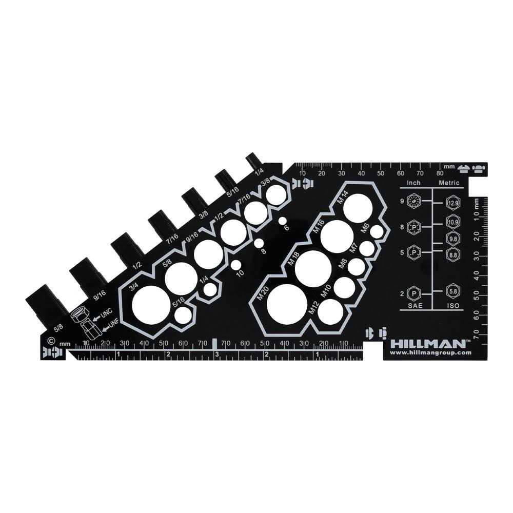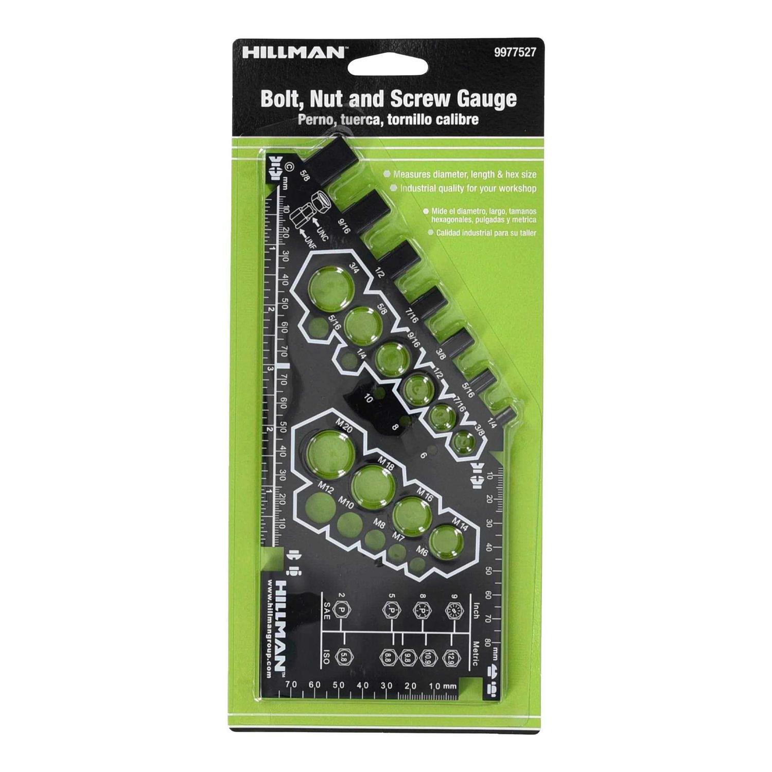 Hillman Bolt, Nut, and Screw Gauges are perfect to have handy in every tool box or garage, bringing an industrial-quality measurement tool to your workshop. This gauge tool measures diameter, length, and hex size across myriad fastener types, ensuring you have the right part for the job every time.