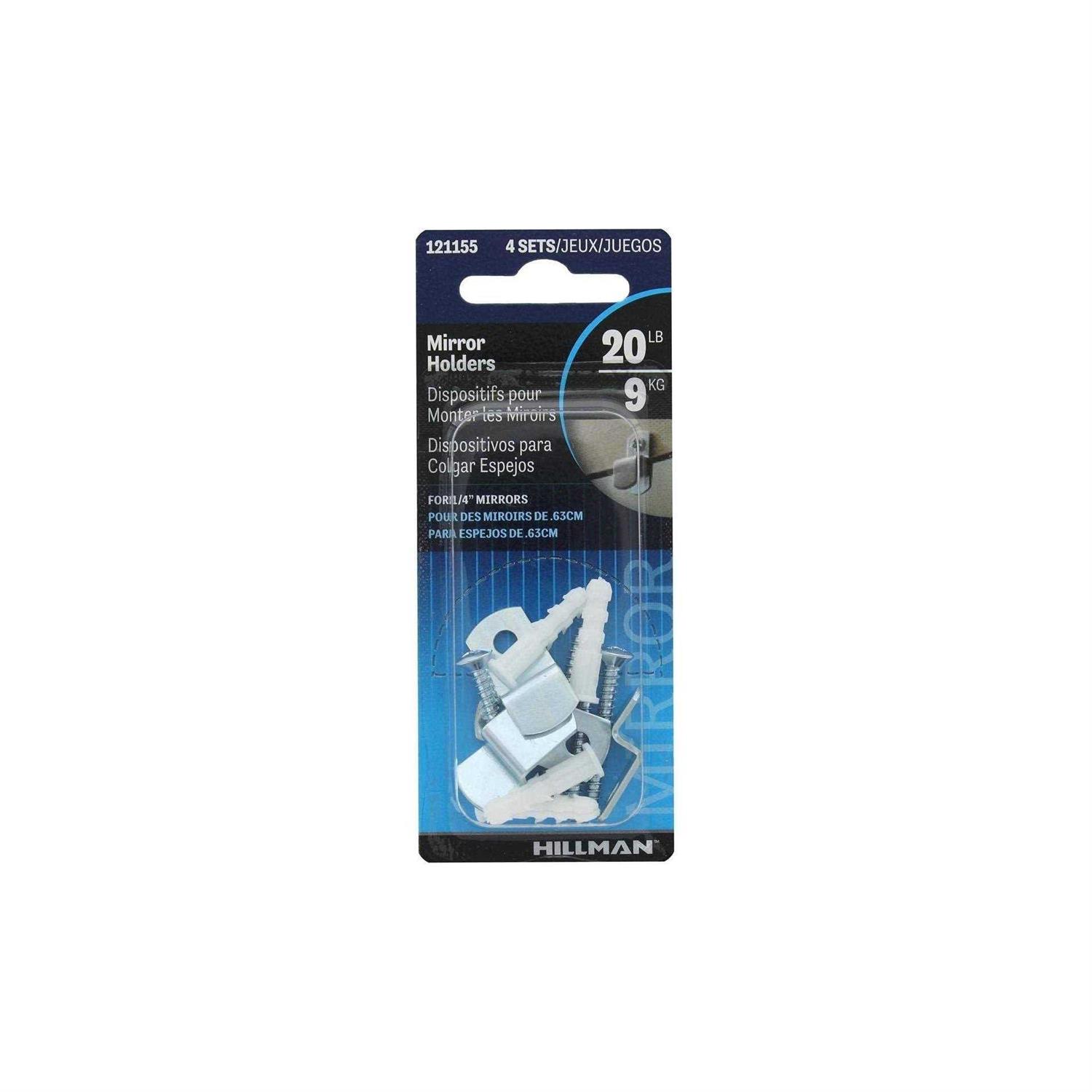 For up to 1/4″ thick mirrors. Metal clip is 1″L x 1/2″W x 1/2″D. Steel zinc. 4 metal clips with mounting screws & hollow wall anchors.