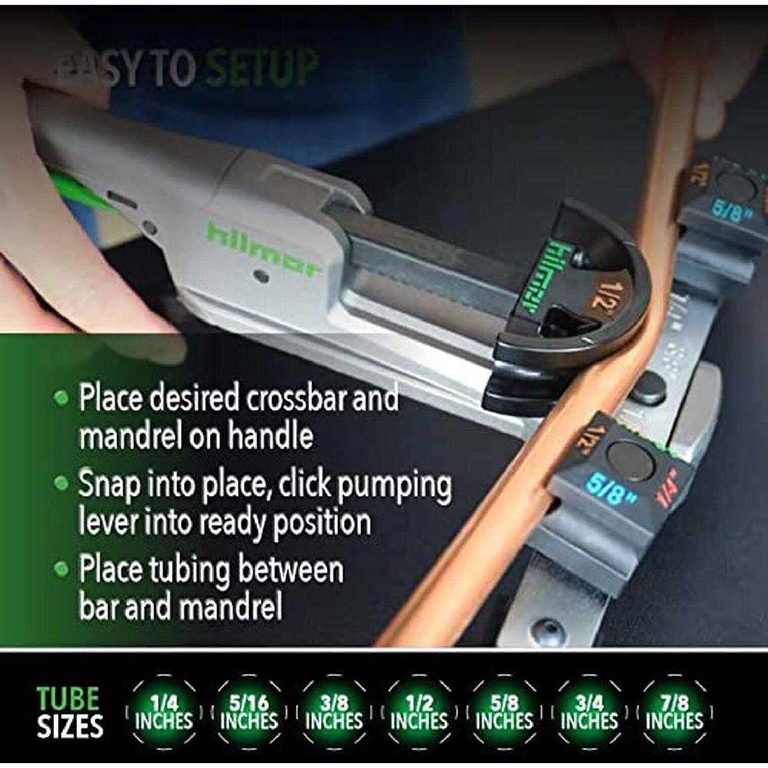 Overview for hilmor 1839032Small in size. Big on advantages. The hilmor Compact Bender will help you get the job done right – from start to finish. Small-space capabilities one-handed operation and precise bends – you get it all. A universal crossbar and color-coded mandrels provide simple setup and easy size identification. An advanced mandrel design and quick-release mechanism allow for an easy tube release. You can count on precise bends of 1/4 inches 5/16 inches 3/8 inches 1/2 inches 5/8 inches 3/4 inches and 7/8 inches tubing up to 90 Degree or 7/8 inches mandrels.