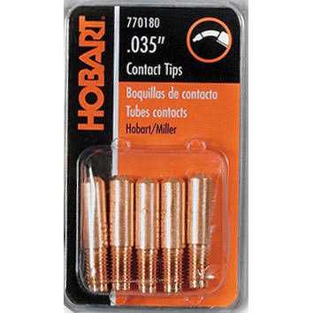 Hobart 0.035″ MIG contact tips compatible for use with millermatics, hobart handler 135 and 175, hobart ironman 250, later hobart beta-MIG 1800 and 2510 welders. Product style contact, works with select hobart welders, product type tips, size 0.035″.