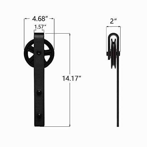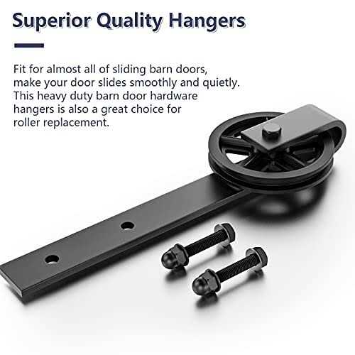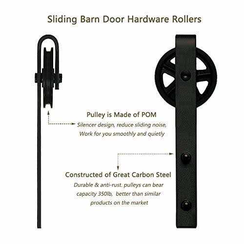 Specific Characteristic:Fit 1 3/8-1 3/4″ thickness door panel , the door weight capacity is 350 lbs, that’s better than similar products on the market. Superior Quality: The hanger is made of high-quality carbon steel, and wheel is made of POM, silencer design, reduce sliding noise, Not only is it quiet, but also strong and durable, frosted black surface treatment, anti-corrosion and years of beauty. Package Included: 2* Big Wheel Hangers, 4*Long Door Screw, 2*End Caps, 1* T Shaped Floor Guide. Versatility: Suitable for a Varity of sliding barn door,the first choice for home decoration, especially American Style.