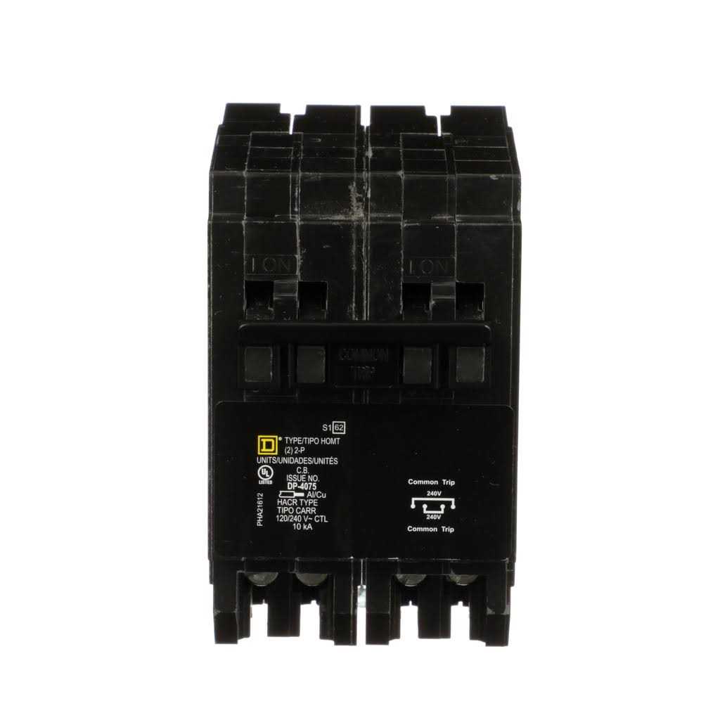Homeline miniature circuit breakers are engineered and designed for fast installation and superior circuit protection. Homeline circuit breakers are designed to plug into Homeline load centers to provide circuit protection. The HOMT circuit breaker is two tandem 2 pole thermal magnetic circuit breakers manufactured in tandem. This quad tandem breaker occupies two HOM pole spaces. This quad tandem circuit breaker consists of a two pole breaker and a two pole breaker. This quad tandem circuit breaker provides a standard circuit protection and is HACR rated. One of the two pole breaker is rated 30A at 120/240 VAC and other two pole breaker is rated 50A at 120/240 VAC. This circuit breaker provides 10 kA breaking capacity. The 30A two pole breaker of this quad tandem breaker will accept 14 AWG to 8 AWG copper or aluminum wire. The 50A two pole breaker of this quad tandem breaker will accept 14 AWG to 6 AWG copper or aluminum wire. The tandem breaker is 3.13 inches tall 2.00 inches wide and 2.98 inches deep. HOMT tandem breakers are UL Listed.