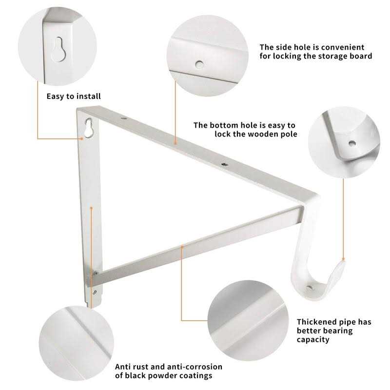 Holds rods with up to an 1.3 inches diameter. Closet Pole Support Bracket include portions for supporting both a clothes rod and a shelf. Easy to install, both for closet and wall bracket. Durable, scratch resistant, very sturdy and solid, made of heavy duty metal. Add extra storage space, create more space of wall for storage or display in cloakroom.