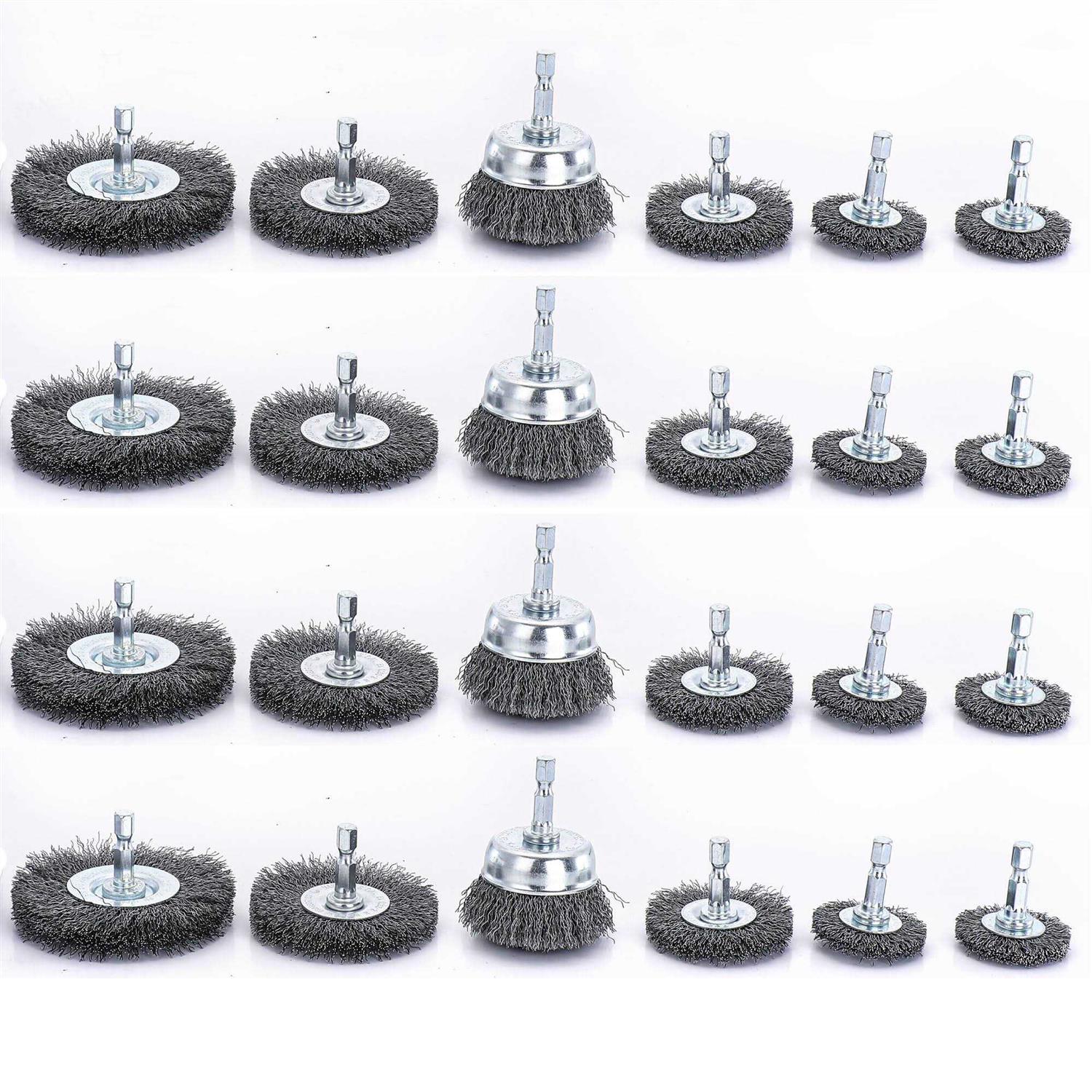 *Size:Wheel diameter: 3 in., 2-1/2 in., 2 in. and 1-1/2 in. (2),Cup diameter: 2 in. *Clean virtually any surface quickly and easily with this wire wheel and cup brush set. *The crimped wire cup brush is rigidly secured to a safety-designed cup-shaped metal holder for added durability and efficient use. *These tough wire wheels are well-filled with crimped, untempered carbon steel wire. The diameter of the steel wire is reduced from 0.0118in(0.3mm) to 0.010in(0.27mm), which increases the strength of the steel wire. It has reasonable bending design of the curve and also increase the number and thickness of the bristles(1-1.5times) to ensure that the wire will not quickly fall off during the operation of the brush wheel in the shortest time and works more smoothly . *APPLICATION:Roughening,planing,deburring,edge honing,structuring,descaling,paint stripping,weld seams, derusting, grinding,finishing,polishing and surface treatment of metals, cast steel,non-ferrous metals, steel ,soft wood and hand wood materials.