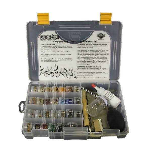 Repair cigarette and other small burns on upholstery, sun visors, door panels, headliners. Each kit contains 27 colors, 1 velour puffer bottle, 1 bottle of adhesive, 1 dual-end detailing brush, 1 soft grip nylon brush, foam and 1 razor blade, all in a handy carrying case. Sufficient velour to repair over 1,000 burns.