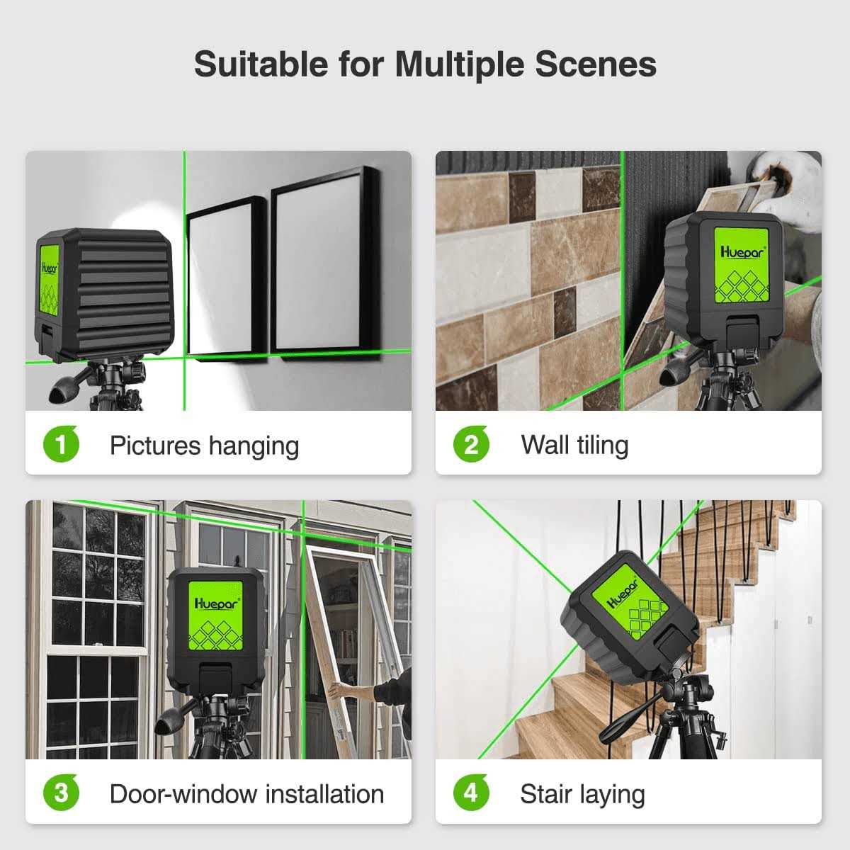 - “GREEN CROSS LINE LASER: Huepar cross line laser level adopted advanced bright Osram’s green laser technology