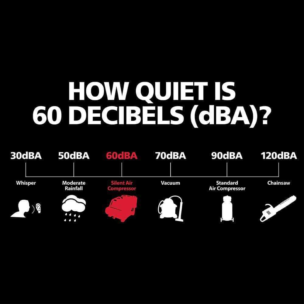 Silent Air Compressor is the ideal tool to power home improvement and DIY projects. Its lightweight design (only 30 lbs.) and powerful 1/2 HP motor delivers 0.8 SCFM @ 90 psi with a noise level of only 60 dB. The integrated metal control panel comes with a large regulator knob, 2 metal case gauges and a quick coupler to make connections a snap. The reinforced frame protects the motor from damage and includes convenient cord storage. This compact compressor also features a rubber reinforced handle for easy portability and a built in storage bag to hold tools and accessories. You will find this sturdy compressor is perfect for jobs like inflation, cleaning and operating a stapler or a finishing nailer with ease.