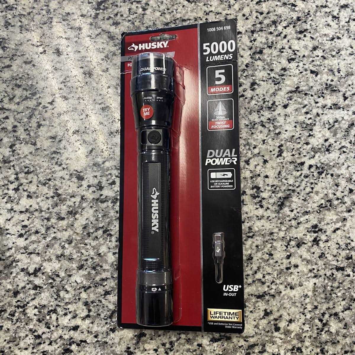 The Husky 5000-Lumens Dual Power Rechargeable Flashlight provides brightness and extreme long life. This 5-light mode flashlight brings superior optics and color. The twist focusing makes switching from spot to flood a simple twist. Included is a rechargeable battery for super long-life, which can be charged without removing the battery. Also included is a USB C charging cable for super-fast charging. The Husky 5000-Lumens Dual Power Rechargeable Flashlight can also be powered by 9 AA alkaline batteries (not included). This rechargeable flashlight is impact resistant, weather resistant and virtually unbreakable. Tested and rated to ANSI/FL1 standards.