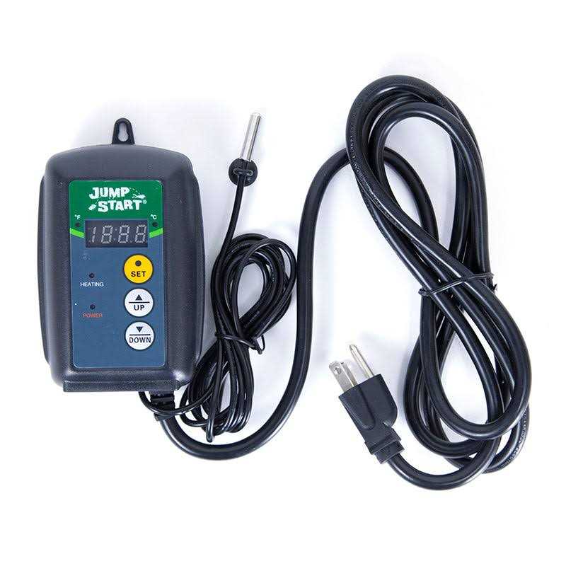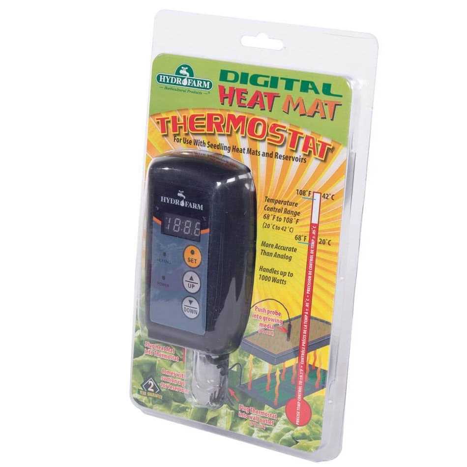 Control the temperature of your heating mats with ease with this HydroFarm MTPRTC digital temperature controller. This heat mat thermostat is digital for greater accuracy and is compatible with all heat mats. It provides constant optimum temperatures for specific crops, controlling the temperature in colder or warmer environments. The thermostat includes easy-to-read LED indicator lights and a 3-prong grounded plug, simply plug the controller into a wall outlet then plug the heat mat into the thermostat. Operating at 1,000 watts and 120 volts with a rated amperage of 8.3, this digital controller is the ideal choice to work with your heating mats.