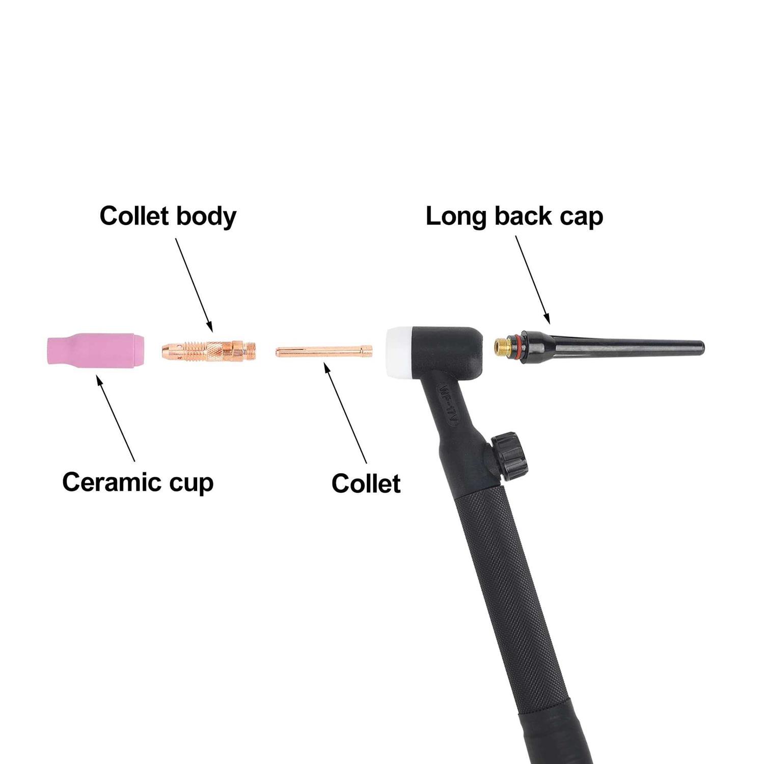 Tig Torch Type : 150-amp air-cooled WP-17V complete TIG welding torch ,13 FT cable,35% DC 140AMP, 35% AC 125AMP,Quick Connector: 10-25mm, Electrode Size: 0.5-2.4MM. Strong Compatibility: The TIG welder gun great for TIG welding on thin to medium gauge materials, with lift tig lift arc function. Ideal replacement for most mainstream welders ,like:HB Mig 200/Mig 250/MT2000/HBM 1200/warfox ST200D /hynade MTG155D MTG165D MTG165SG MTG175SG MTA200PRO MTA225SG. Tig Welding torch design: designed with comfortable handle, Simple structure, easy to replace. gas hose and power cable is separated, used for independent connection with the gas outlet of the welding machine or directly connected with the argon flowmeter. Tig Torch Material: High purity copper wire , multi strand interwoven into cables , low resistance conductors with large carrying capacity . Nylon Cable Cover, high heat dispersion performance. Package: 1 * TIG Torch,3 * Ceramic Cups,3 * Collets,1 * Collet Body 2.4mm,1 * Long Back Cap,1 * Short Back Cap(Note:Some parts are already installed on the gun ).,,hynade