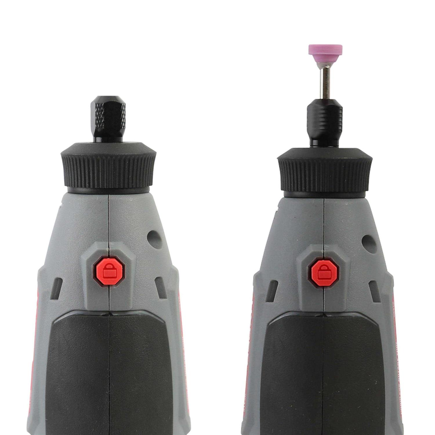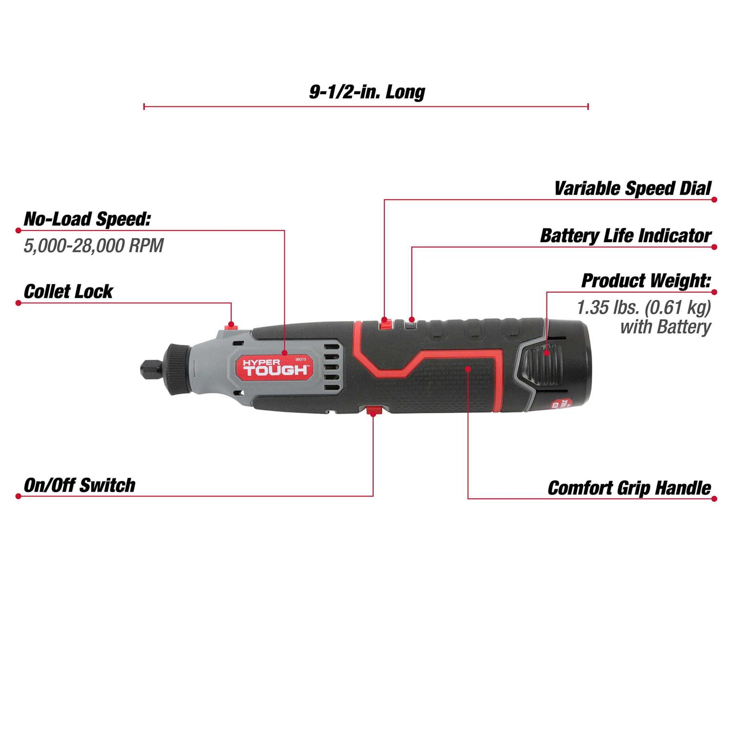 The Hyper Tough 12-Volt Lithium-Ion Rotary Tool offers high performance and versatility in a cordless, compact and portable design. This rotary tool includes 40 accessories allowing you to tackle more DIY and home improvement projects with high-precision. This 12V rotary tool has a range of 5,000- 28,000 Rated RPM which gives you the power to cut, grind, and sand most materials with ease. The 7-setting Variable Speed Dial, and ergonomic 360-degree grip zone body provides optimal control for any application. This rotary tool features a battery life indicator helping you to work efficiently.
