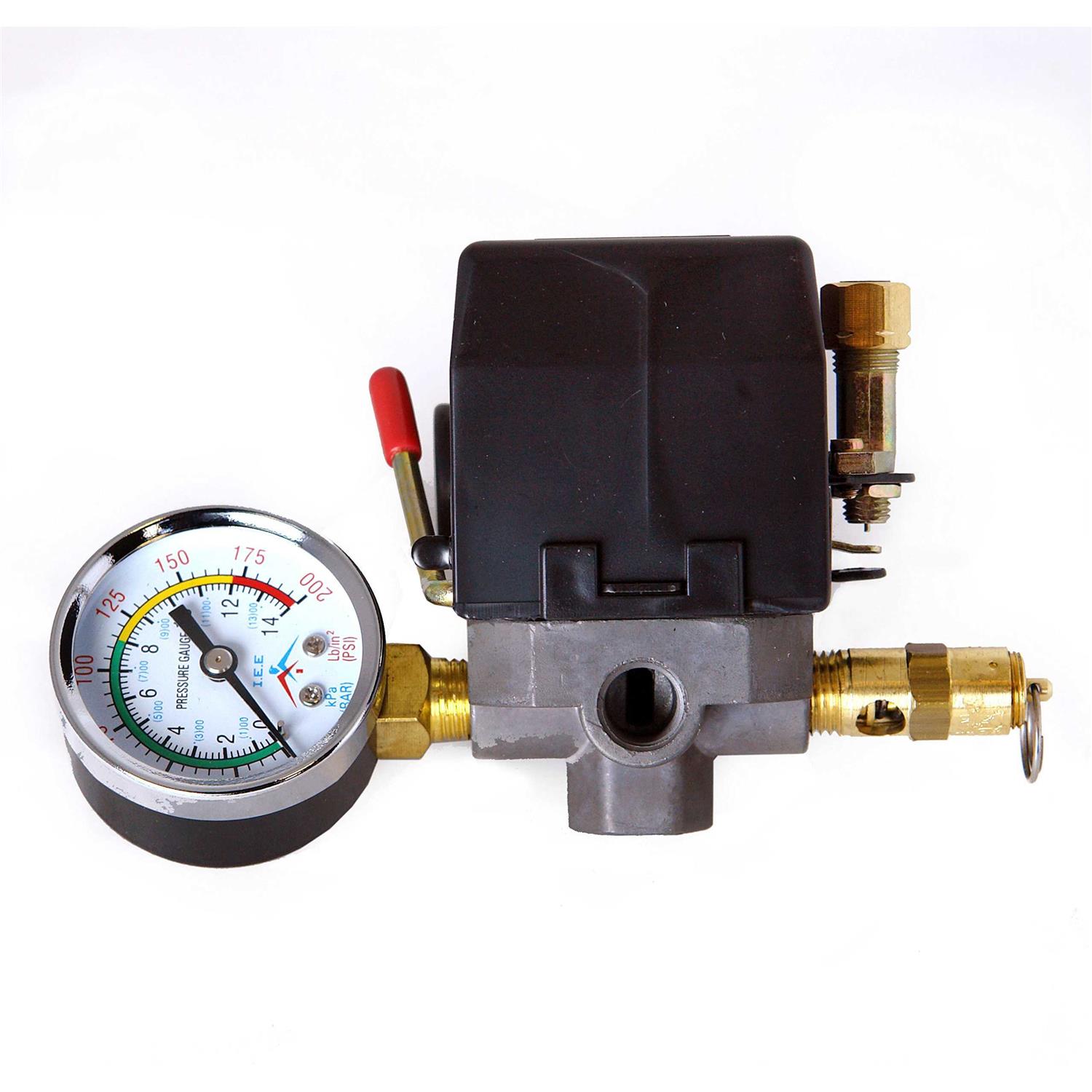 • Air Compressor Pressure Control Switch 4 Ports 95-125 PSI w/ 0-200 Pressure Gauge and 150 PSI Pop off valve