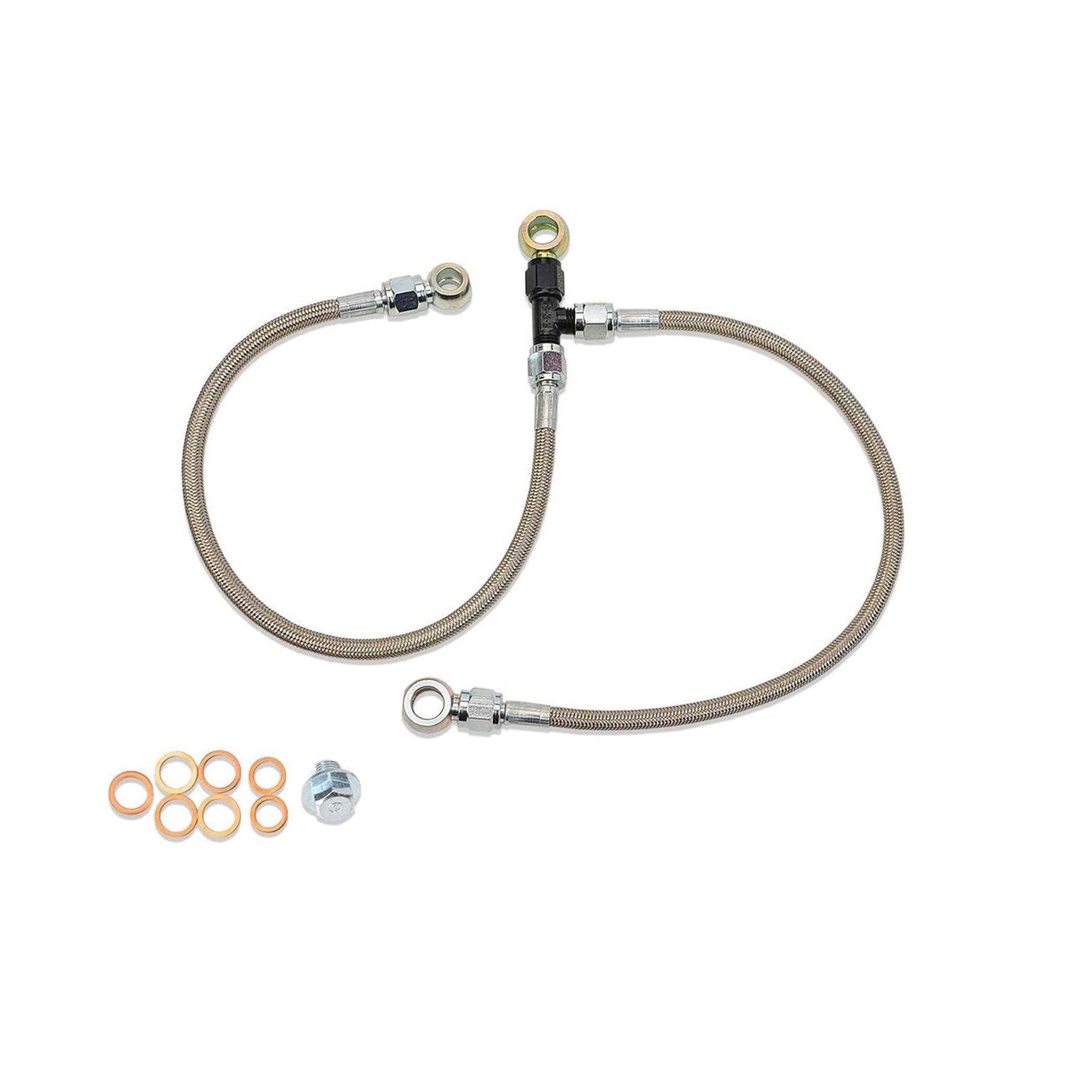 The OEM turbo oil feed line is a known weak point that can be easily damaged when removing or installing a turbo. The IAG stainless steel AVCS and turbo line kit is a bullet proof solution that allows removal and installation of the turbo without purchasing a new OEM hard line. Our line kit is easily installed and does not require removal of the intake manifold or crossover pipe. The banjo fittings are made from steel and coated in zinc for corrosion resistance. The braided lines are suited for a high temperature environment and feature a teflon coated inner liner. Application Help Part# IAG-ENG-2070 is the standard kit that is used on the majority of stock location turbo cars. It uses a 10mm banjo fitting that bolts to the turbo oil feed port. This kit will work with any non-ball bearing turbo that utilizes a 10mm banjo style oil feed. If your application requires a different oil feed fitting, you can simply unscrew the banjo and you will have a female -4 AN to which you can connect the fitting of your choice. Optional Fittings: These fittings are not required for installation unless they are stripped, missing or clogged. Part# 15194AA110 OEM Turbo Oil Restrictor Fitting (At Turbocharger) Part# 14445AA090 AVCS Filter Fitting (Filters the oil before entering the AVCS controller and Cam Gear) Part# 15194AA270 Cylinder Head Oil Fitting