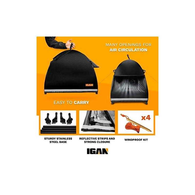 IGAN Inverter Generator Cover While Running Protects your generator investment during inclement weather. A revolution in generator running cover, with strong protection, toolless installation is designed for inverter generators from 1000 to 2300 watts, and allows you to operate your generator safely outside in nearly any type of weather. Operational Safety US patent, a multi-function running cover designed for small inverter generators. Operate your 1000 to 2300 watt inverter safely whether in rain, snow, high winds or wet weather. While avoiding CO poisoning, electrocution and generator damage. Durable & All weather resistance Heavy-duty & 100% waterproof tarpaulin can keep the outlets covered and dry while in use. The sloping roof canopy at the rear extends outwards to provide natural airflow and would not block the exhaust vent. Convenient IGAN leading design allows you to easily start, plug in and refuel the inverter without removing the cover. Featuring with huge TPU transparent electric panel cover, to know the status of the generator anytime and anywhere. Windproof and non-slip performance 1. Non-slip rubber feet. 2. Heavy-duty metal frame base. 3. Featuring 4 outdoor tent stakes and ropes. Multipurpose The IGAN generator tent can be used as a storage and running cover. Important Note This model is only for fully encased small inverter generators up to 2300 watts. Not fit for open framed portable generators.