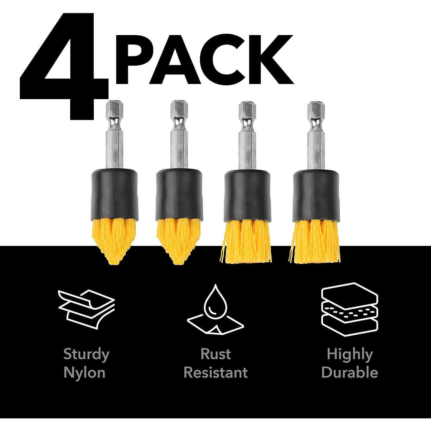 Power Through with Sturdy Bristles — This uniquely-made small design of these power drill brushes for cleaning will remove stubborn stains in hard to reach places, with half the effort. Each scrubber drill attachment is made of medium stiff synthetic bristles and slides right into your cordless drill 2 Brush Options for a Deeper Clean — Upgrade your home cleaning kit with your choice of scrub brush drill attachment. Get into extra small spaces with the tapered drill scrub brush. Polish your wider surface areas with the flat brush head Quick Change Shaft — This 2.5”L with ⅝”L bristles drill cleaning brush attachment set is designed with steel and nickel-plated quick change shafts. These drill brushes are compatible with cordless drills that accept 1/4″ shaft accessories Value Pack — This drill scrubber brush kit comes with 2 sets of brush head options: 2 tapered brushes and 2 flat brushes. Use one cleaning brush drill attachment set for scrubbing the bathroom tiles and a separate one for cleaning your kitchen sink Use In & Out of Your Home — Remove grime on every surface in your home with these cleaning brushes for drill.