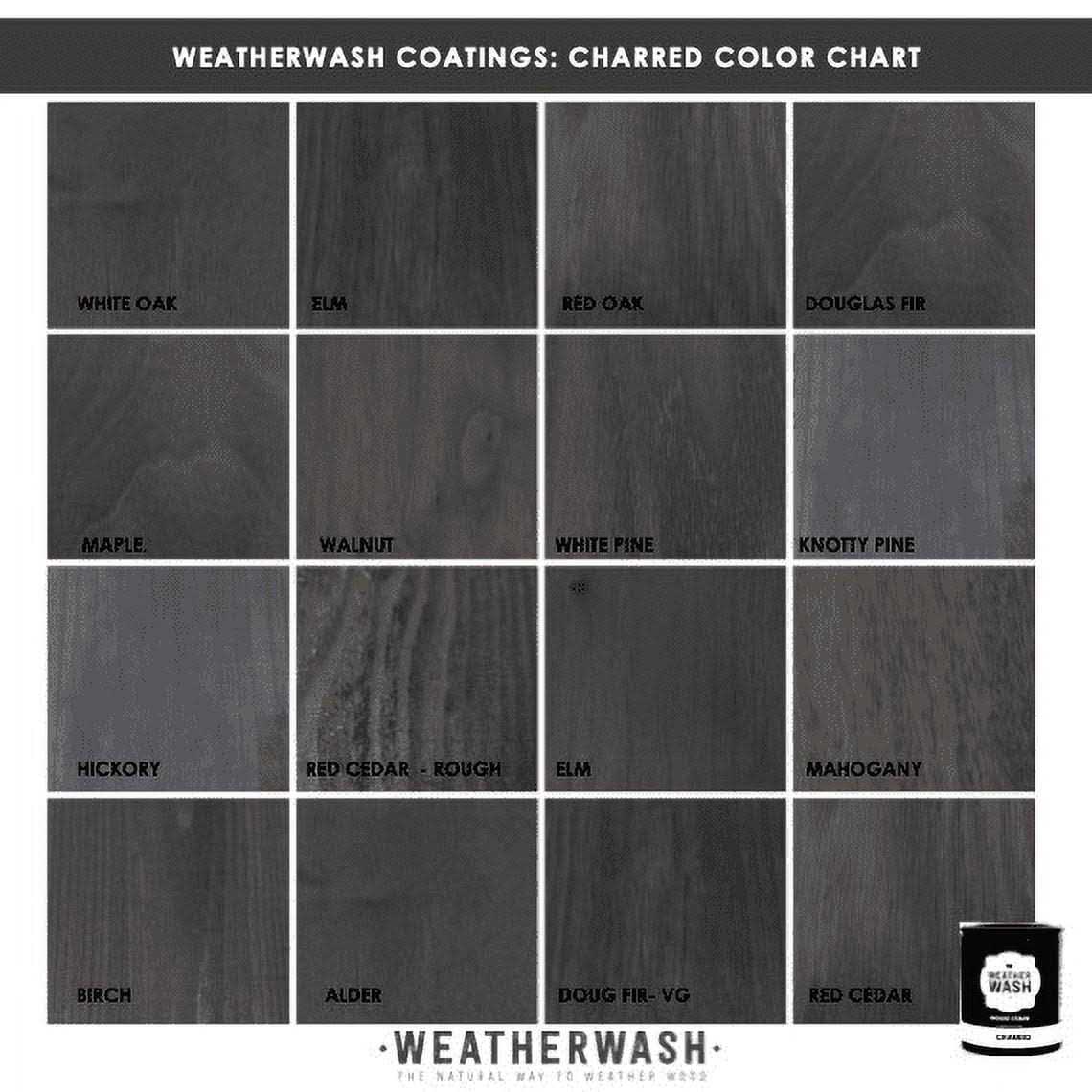 Weatherwash Charred is a reactive wood stain that oxidizes wood, just like nature! Charred stain gives wood the perfect blackened charred effect in just one step. Great for wood surfaces, including floors, cabinetry, millwork and furniture! Charred is an interior stain, suitable for hardwoods, soft woods, veneers, pressure treated wood & reclaimed wood. Protect with wood and color with Weatherwash Varnish or Polyurethane topcoat. Quick dry formula with easy soap and water cleans up. Apply VOC free wood stain with a foam or synthetic bristle brush, water-based interior wood stain is dry to touch in 30-minutes. Color wood species dependent, check WEATHER WASH color chart. Coverage gallon: 400 sq. ft., quart: 100 sq. ft. Use WEATHER WASH topcoats to maintain the look of WEATHER WASH stained wood. Use on raw wood, sand, or strip off existing wood finishes before using. Quickly creates a blackened charred look on wood interior and exterior floors, cabinetry, siding, millwork, doors, trim, paneling and more. Looking for darker shades, easily apply multiple coats for darker results.