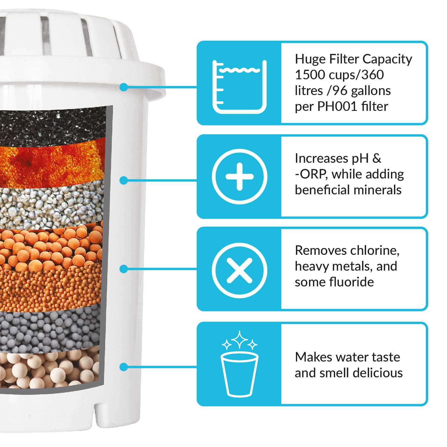 Our faucet water often contains acidic elements, pollutants, and chemical additives like fluoride and chlorine, leading to undesirable odor and taste. While many turn to bottled filtered water as a solution, it not only becomes costly but also contributes to environmental harm due to the use of single-use plastics. Enter the PH001 multi-stage water filter – a game-changer in water purification. This filter adeptly eliminates chlorine, fluoride, heavy metals, and impurities, all while enhancing the water’s pH level, infusing beneficial minerals, and vastly improving both taste and scent. Designed for seamless compatibility, the PH001 filter works perfectly with the pH RESTORE and pH REFRESH pitchers, as well as the pH RECHARGE countertop dispenser. HUGE Long-life 1500 cup, 96 gallon capacity. Multi-stage filtration system starts with a ‘Micro Net’ to catch nasty particles, allowing beneficial minerals though. KDF purifies, removing heavy metals chlorine, & some fluoride. US Coconut Shell Activated Carbon (GAC) charcoal removes chemicals & pollutants. A 2nd Micro Net removes particles that ‘slipped through the net’ of the first Micro Net, KDF & GAC. Small sized oxygenated water molecules can more easily penetrate your cells, improving hydration, energy levels & mental clarity. Drinking water that is pH 8 or above our bodies become more alkaline, reducing the acidity caused by modern lifestyles. Removing bacteria & heavy metals our body can detox!