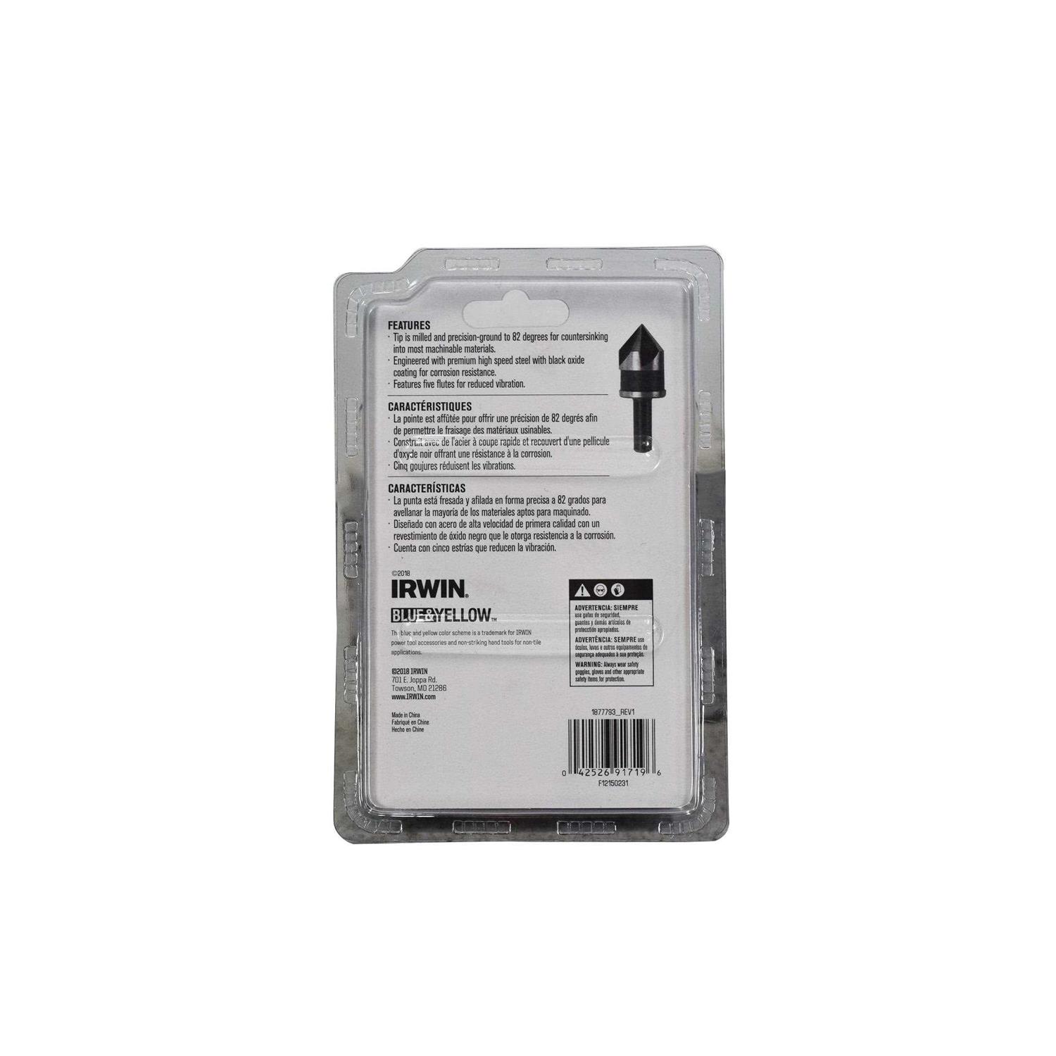 Irwin High Speed Steel Countersinks feature a precision-ground 82-degree tip that makes them ideal for countersinking into most machinable metals. They’re made from industrial grade high speed steel for increased durability, and they include a black oxide finish for added corrosion resistance. The five flute design reduces vibration for smoother drilling and extended life. Plus, the 1/4″round shank fits all handheld and stationary drills.