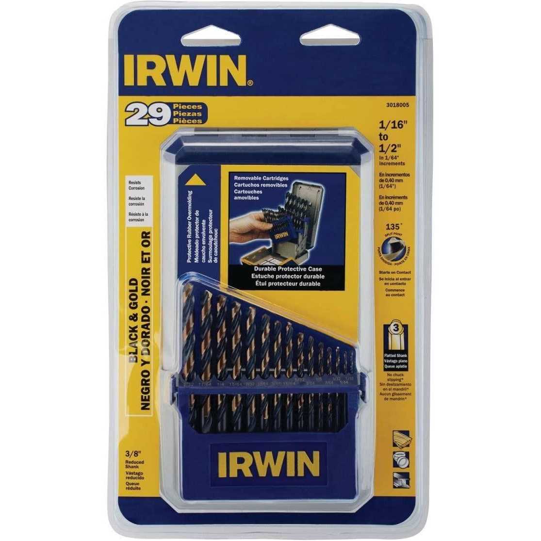 IRWIN 29 Piece Black And Gold 1/16″ – 1/2″Metal Index Drill Bit Set with 1/64″ increments features turbomax tip that starts up to 10x faster and automatic indexing for easy bit access and identification. Drill bit kit has flatted shanks above 11/64″ that eliminates slippage in drill chuck and reduced shank above 3/8″ allows the use of larger drill bits in a 3/8″ chuck. It includes tap and drill selection chart for convenient reference removable cartridges that is easy to carry bits from case to worksite and treatment that resists corrosion preventing bit from rusting. It comes with a rubber overmolded case that protects kit if dropped.