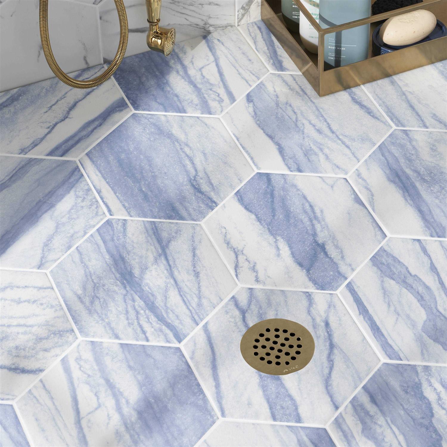 The Macauba and Calacatta Hex Collection optimizes the natural beauty of marble for the modern space using porcelain. Formed into a best-selling 10 in. hexagon format, these marble-look porcelain tiles realistically recreate the bold veining and pattern of two of the most coveted natural stones in the world: Calacatta and Macauba marbles. Blue and gray colorways offer a sophisticated and contemporary iteration of these timeless marbles, creating a bold and impactful look in any space. Suitable for floors, backsplashes, fireplaces, and more, these elegant tiles complete and elevate any style or decor.