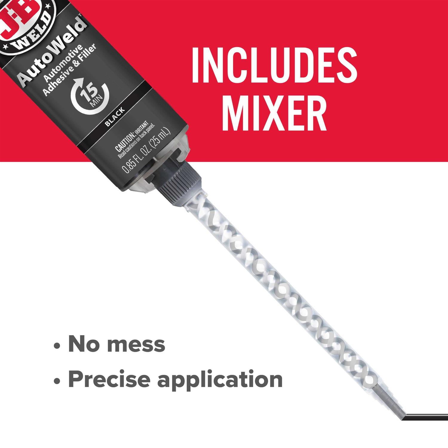 J-B Weld AutoWeld is a high-strength, impact-resistant automotive adhesive, filler & sealer. AutoWeld dispenses in a 1:1 mix ratio, sets in 15 minutes, and can be sanded and painted in 30 minutes. Once cured, AutoWeld has a strength of 3770 PSI J-B Weld AutoWeld comes with self-mixing static mixer making the application easy! Prior to attaching the static mixer make sure equal parts of the A and B side are coming out the syringe, then apply the mixer and go! J-B Weld AutoWeld is ready to be sanded and painted after 30 minutes! J-B Weld AutoWeld is great for bumpers, grills, dashboard & trim, body/door panels and more! J-B Weld AutoWeld will not shrink over time further enhancing the longevity and durability of the repair!