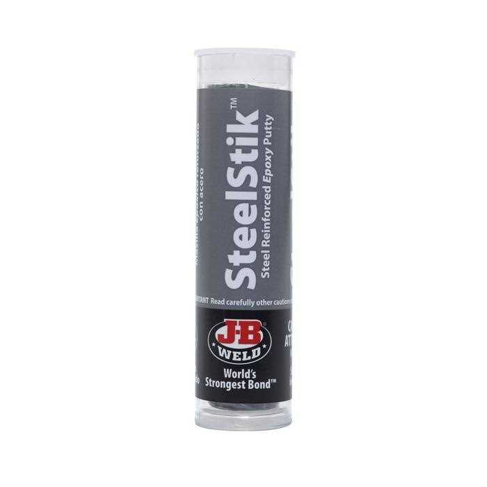 J-B Weld SteelStik is a hand-mixable, steel-reinforced, non-rusting epoxy putty that quickly repairs or rebuilds anything made of metal. After mixing, it forms an industrial-strength polymer compound that can be molded into shapes or used to build up, patch and repair steel components. SteelStik sets in 3-5 minutes and after 60 minutes, can be drilled, tapped, machined, ground, filed and painted. SteelStik cures to a dark grey color, is rated at a tensile strength of 900 PSI and will withstand continuous temperatures up to 350°F.