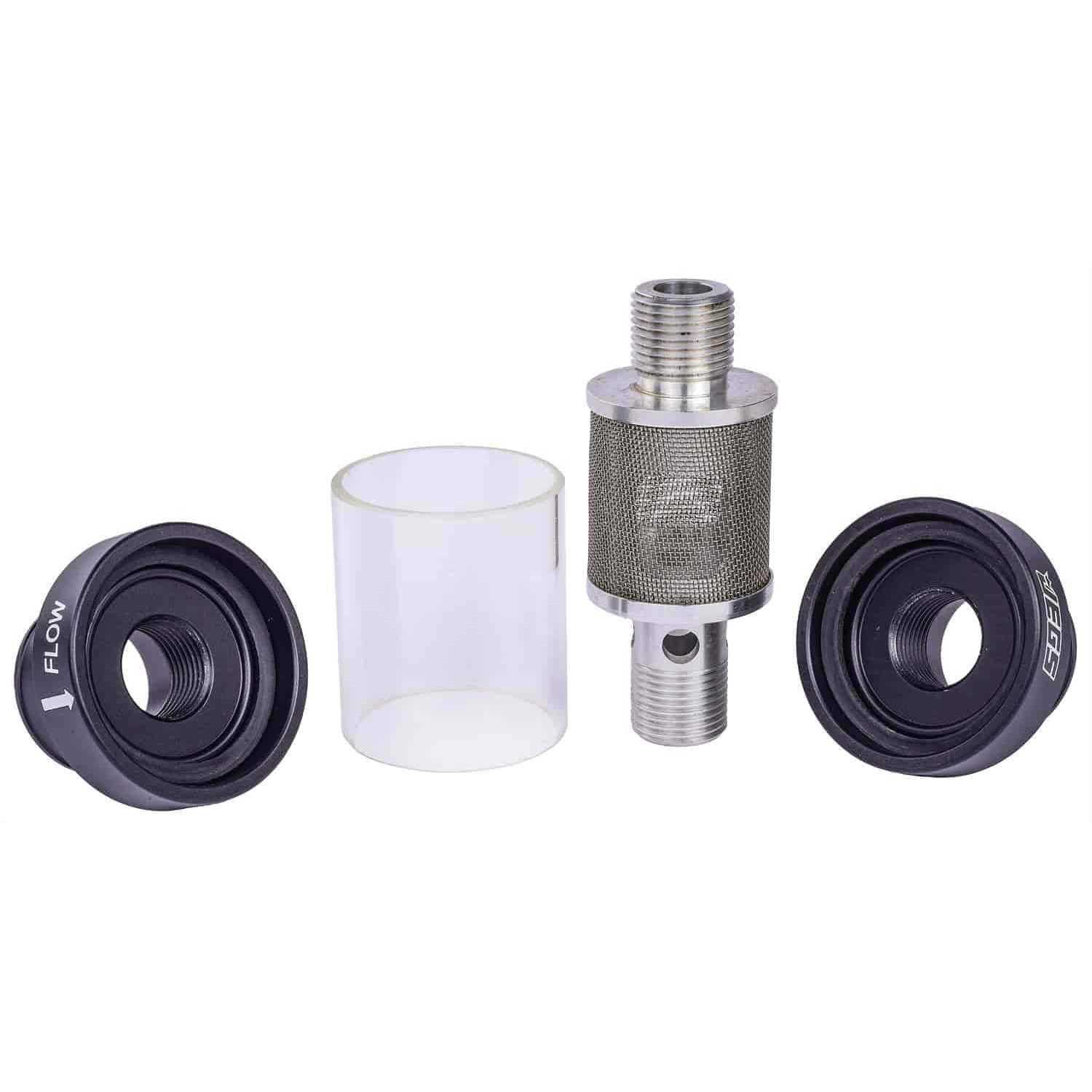 OD Black Anodized Finish Billet Aluminum Ends Glass Center Stainless Steel Filter Includes (1) Filter (2) Hose Clamps The JEGS 53263 coolant filter keeps your coolant system free of debris. This unit features a transparent glass tube that lets you monitor coolant flow and debris buildup. Constructed from threaded billet aluminum, this filter is easily disassembled for cleaning. Features Fits hoses with a 1 1/2 in. ID (Inside Diameter) Both end caps have rubber gaskets to seal against the glass tube Mesh: 600 microns Dimensions: Overall: 4 7/8 in. L x 2.325 in. D Glass: 2 3/8 in. L x 2 in. D Inside diameter: 0.475 in. The anodized coating protects the aluminum from corrosion Hose clamps: 33 mm – 57 mm Note: This filter is directional. Make sure it is installed to match your vehicle’s coolant flow.
