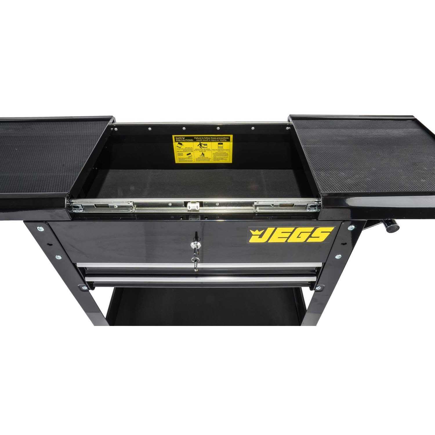 L x 15.2 in. W x 38 in. Total Capacity Black w/ JEGS Logo Includes: (2) Keys (6) Drawer Liners Dimensions: 27.2 in. long x 15.2 in. wide x 38 in. high Unique work bench top is made up of two sliding trays that lock tight for complete security and then pull apart for top compartment access Locking drawers are equipped with ball bearing slides and full-length pulls Bottom tray has a raised lip edge to prevent the loss of any cargo 4 inch caster wheels, (2) swivel with locks JEGS Heavy-Duty Tool Box Cart has a unique work bench top made up of two sliding trays that lock tight for complete security and then pull apart for top compartment access. The locking drawers are equipped with ball bearing slides and full-length pulls, while the bottom tray has a raised lip edge to prevent the loss of any cargo. The trays, compartment, and drawers are all lined to prevent your tools and equipment from damage. Keep your tools handy in this multi-functional tool cart that comes complete with a tubular handle and 4-inch caster wheels for smooth mobility. Dimensions: (2) Top Trays: 12 in. L x 13 3/4 in. W Top Compartment: 27 1/4 in. L x 14 in. W x 6 5/8 in. D (2) Drawers: 22 in. L x 12 1/2 in. W x 1 7/8 in. D Bottom Shelf: 27 1/2 in. L x 14 in. W x 3 1/4 in. D Handle: 15 in. L x 1 in. Dia.