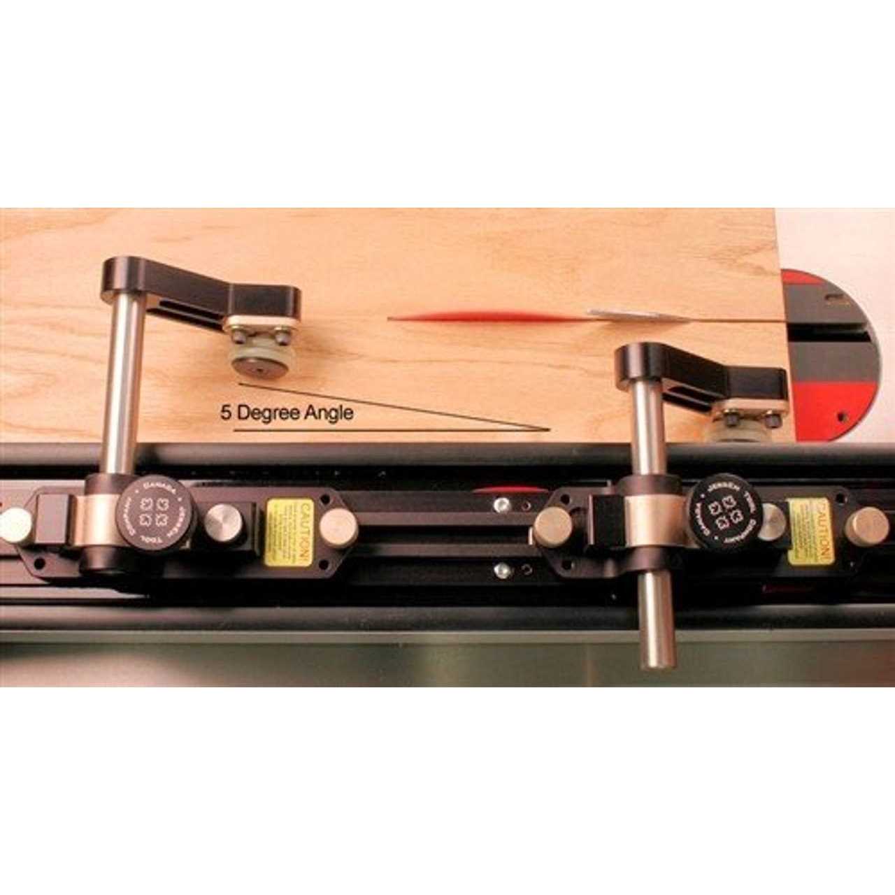 Unique roller system holds down workpiece and pushes into fence for precision stock feed Guides have 3-1/8 of total vertical travel and can be positioned anywhere along HD T-Track Maximum stock thickness from table saw surface to 13/16 above mounting surface Compatible with most T-Style commercial fences using the included HD T-Track Includes two adjustable roller arm assemblies, fence mount HD T-Track, mounting hardware and detailed instructions These Jessem Clear-Cut TS Precision Stock Guides for Table Saws are the ultimate hold-down on the table saw. Multiple featherboards are required to simultaneously hold down and guide material accurately against a table saw fence. Clear-Cut TS Stock Guides operate on the same principle as a stock feeder in that the stock is guided at a slight angle as it is fed forward. Urethane tires on rollers with one-way needle bearings are mounted at an angle to effectively steer your stock toward the fence. Stock is pushed tightly against the fence, and the gripping force of the rollers assists in preventing kickback. All the while the roller arms work under spring pressure to ensure your material is held firmly against the table saw surface.