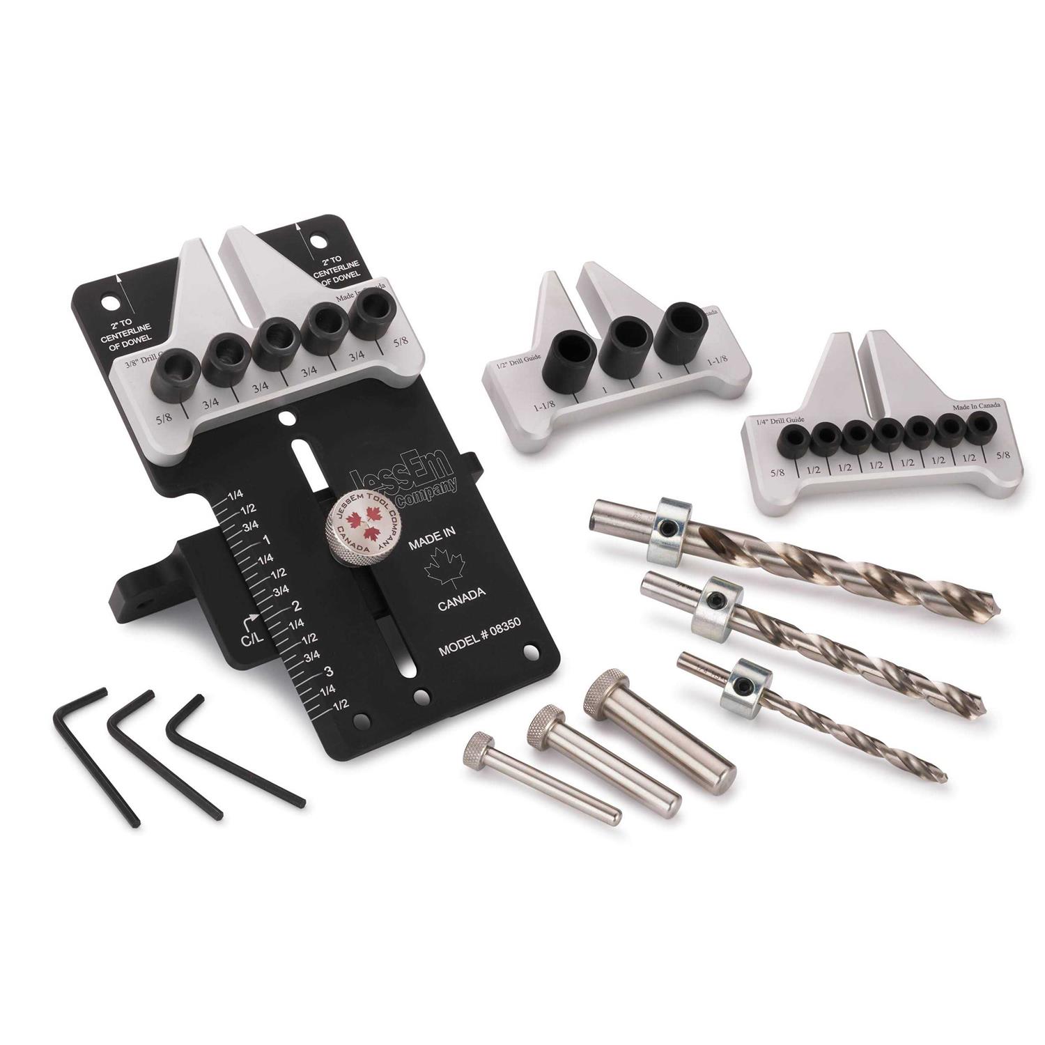 New doweling jig from JessEm. Create 3 size dowel holes on the end or face of your work piece. Locations of dowels can be pre-set in 1/8″ increment’s, perfect for creating multiple dowel hole configurations. Built in alignment slot allows you to match up dowel holes that are spaced further apart for perfect aligned dowel holes. Constructed of precision CNC machined aluminum, anodized for durability and laser engraved for fast set ups. Included are 3 sets of drill guides, along with associated drill bits, collars, and index pins. Maximum edge to center distance for dowel holes is 3-1/2″.