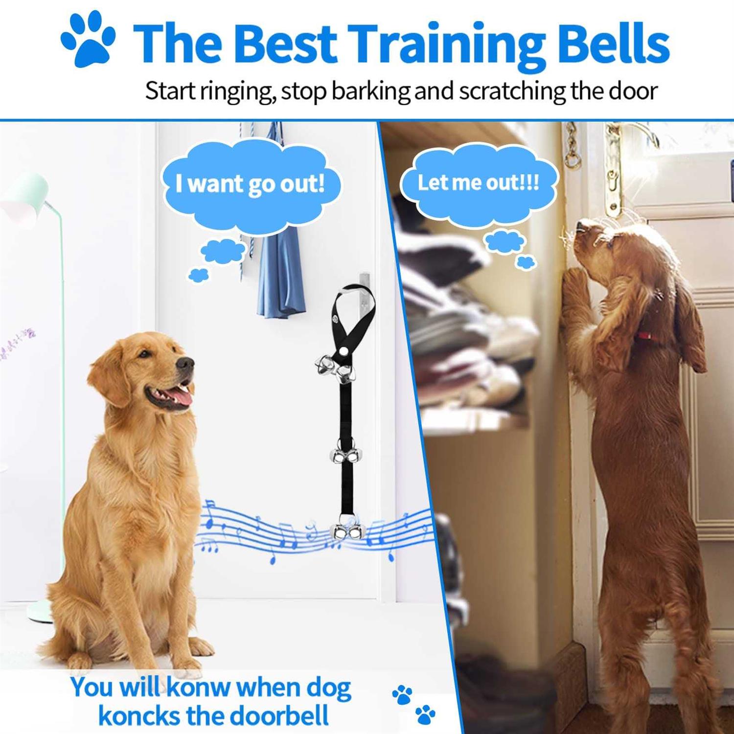 Doorbells by JIMEJV. Details:WHY DO YOU NEED JIMEJV DOG TRAINING BELLS? Using dog bells has been proven to be a simpler, fun and win-win way to be effective, and is recognized by pet professionals. Get your dog to communicate rather than bark. Angry about the scratching broken door? Don’t worry, use our dog training bell to train and communicate with your puppy, you’ll never see this happen again. Use our dog training kit to train stop barking, whatever your puppy want to do, instead of barking, it will knock the bells to remind you, say goodbye to noise. This dog training clicker can help training dog basic obedience and tricks, such as stop barking, cross obstacle, sit, fetch, shake, lie down, and roll etc. Train the dog with our round bells to help correct the bad behaviors, dog can form a better eating habbit and get a healthy body. HOW TO TRAIN YOUR DOG? JUST FOLLOW THESE STEP? STEP 1: Hang the doorbells on the door or hang them on a suitable hook next to the door. Adjust the…