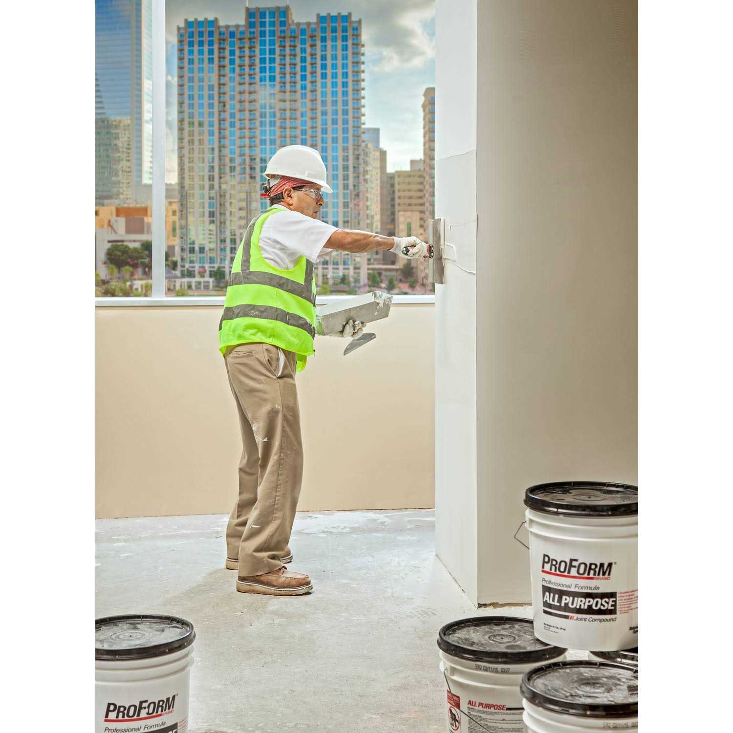 Joint compound all-purpose – professional”proform” pail size 61.7 pounds For tape application, fastener spotting and complete joint finishing of gypsum board. Can also be used to repair cracks in plastered walls, to texture surfaces and to laminate gypsum board to other surfaces such as masonry or other gypsum board. Contains sufficient binder to secure the reinforcing tape and develops its strength and hardness by drying. GREENGUARD certified and can contribute towards a LEED credit.