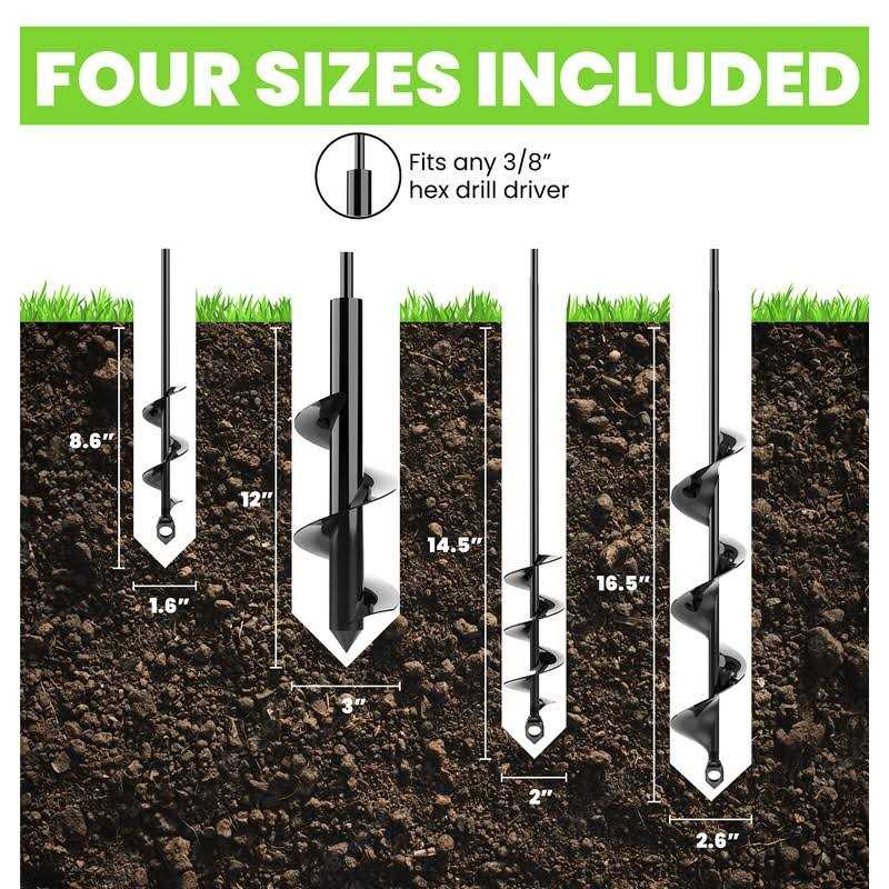 A MUST-HAVE TOOL FOR YARD WORK: While this spiral drill bit is perfect for planting bulbs and bedding plants, as well as shredding up weeds and mixing fertilizer, it’s not just limited to garden work. Easily dig holes for fenceposts, ground lights, outdoor torches, and umbrellas – all with one tool DIVERSE DRILL SIZES FOR EVERY TASK: Our set offers 1.6 x 8.6 inches for detailed planting, 3 x 12 inches for wider holes, 2 x 14.5 inches for horizontal drilling, and 2.6 x 16.5 inches for deeper excavations. Paired with 3/8 inch non-slip drives, these augers are your ideal companions for all your yard digging needs CONTAINS 4 AUGER DRILLS BITS (Drill not included): You’re getting four easy-to-use augers drill bits in this K-Brands value pack. Plus, they’re a breeze to use – all you need to do is attach the auger bit to a standard 3/8″ hex bit drill. Hold with both hands, and then turn it on to dig downward. Reverse the drill to pull the soil back up, and you get the perfect posthole TOSS YOUR TROWEL: You won’t need your gardening shovel with these auger drill bits. 4 Different sizes, made of high quality and heavy-duty steel, each garden drill planter is designed to do all the work of digging holes for you, without you needing to put your back into it. Works on loose soil, hard ground, sand, clay, and even ice CUT YOUR WORK TIME IN HALF: No more blisters or sore hands. Reduce the amount of time it takes to plant a flowerbed or put up a fence. Perfect for digging as many holes as you need, in a fraction of the time it would take by hand