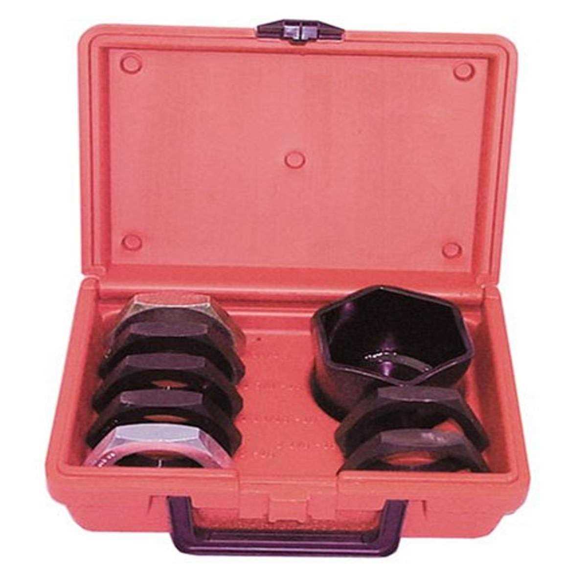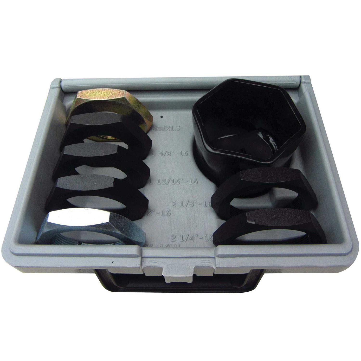 This set aids in the servicing of front and rear floating axle housings on sport utility vehicles, light and medium duty trucks and vans. It contains seven thread restorer dies and one driver socket to refurbish damaged or corroded spindle threads. This set is easy to use.
