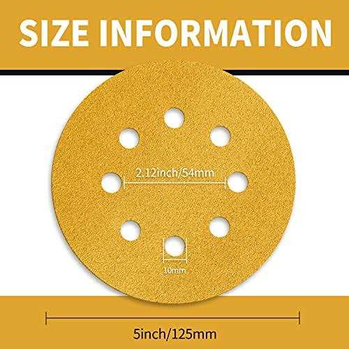 Keeimp 100 Pcs 5-Inch 8-Hole Hook and Loop Sanding Discs, 60/80/120/220/320 Assorted Grits Gold Sandpaper for Woodworking or Automotive 5 inch
