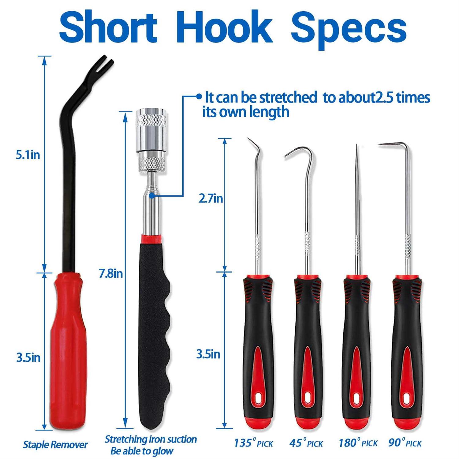 Looking for a versatile pick and hook tool set that can handle all of your repair needs? Look no further than the Keze 11Pcs Precision Pick & Hook Set! This long pick set includes 11 high-quality picks and hooks, making it perfect for repairing cars and other large mechanic projects. With a variety of sizes and shapes, this lock picks set is perfect for anyone looking for a pick set mechanic that can handle any situation. Whether you’re a car mechanic or an amateur DIY enthusiast, this pick tool set is sure to impress. Pick and hook tool set includes 5 larger automotive picks – 6”shafted straight mechanic pick,curved hook,45-degree hook,90-degree right angle pick,and a 1”scraper tool with 4”grip handles(10”/25.4cm full length);Also includes 4 smaller hooks – 3”shafted straight pick,curved hook,45-degree hook,and 90 degree pick tool with 3.5”grip handles (6.5”/16.5cm full length). Has a telescopic magnetic tool long handle and it extends from 7”to 30”. It helps to grab objects in far to reach places for example:nuts,bolts,screws,jewelry,and other lost metal objects With its durable construction and easy-to-use design, this pick ser is perfect for professionals and beginners alike. So why wait? Order your Keze pick & hook kit today and start tackling all of your repair projects with ease!