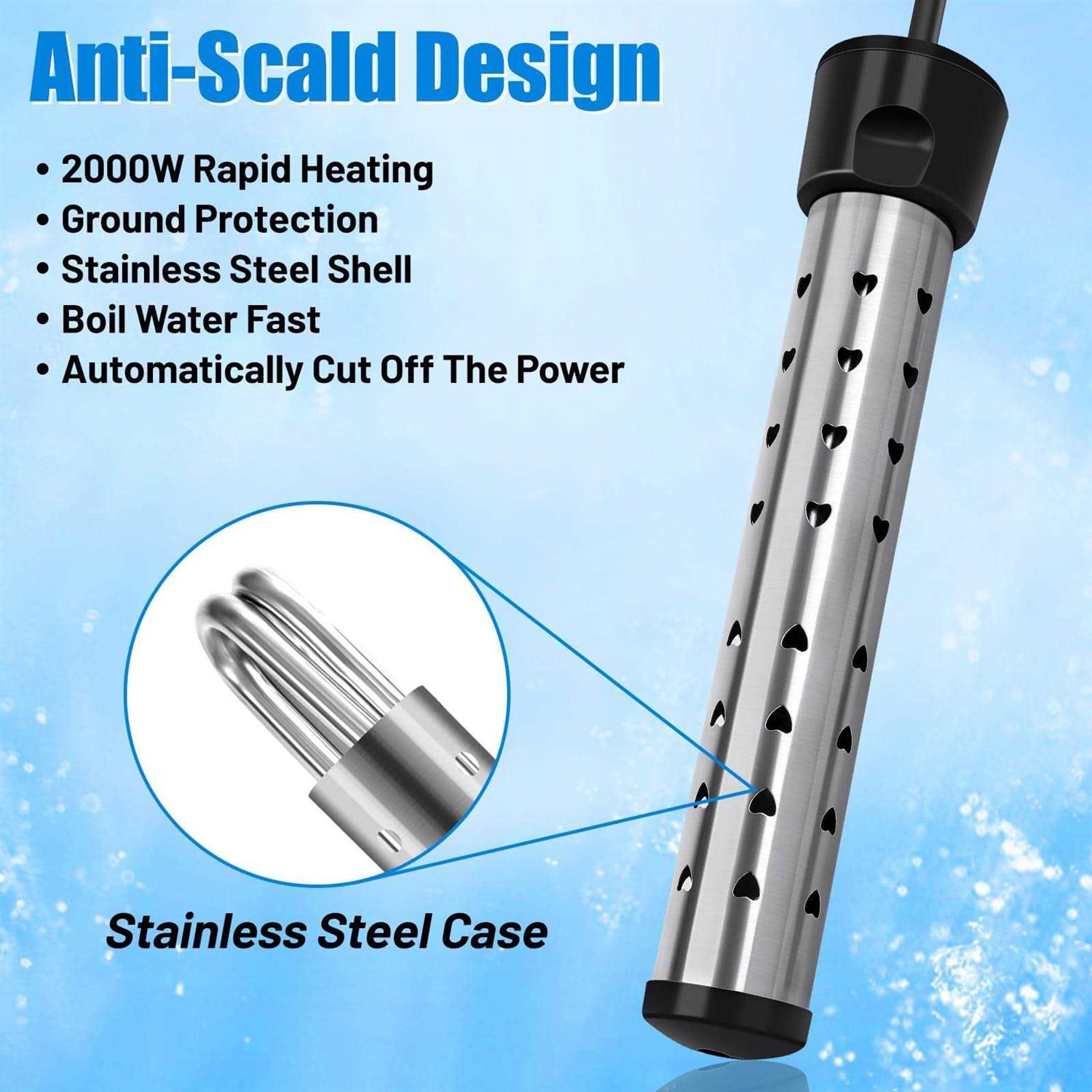 【2000W Fast Heating】 The immersion water heater is rated at 2000W and operates at 110-125V AC. Porous design with good thermal conductivity. 2000W high power electric water heater can heat up to 5 gallons of water in minutes, heating faster. Saving you time and electricity consumption. If you have a lot of water, just increase the heating time 【Safety Protection】 Prioritize safety with our immersion water heater. Engineered with built-in safety features such as automatic shut-off, overheat protection, and a sturdy rust-resistant 304 stainless steel cover, it ensures worry-free usage. Enjoy hot water with confidence, knowing your immersion heater is designed with your safety in mind. Note: Do not touch water when connecting the power to prevent electric shock! 【Easy to Use】 Enjoy hassle-free operation with our immersion water heater. Please make sure the immersion heater is completely submerged in water, and then connect the power supply. Equipped with an LCD liquid crystal thermometer, after heating for a period of time, the probe of the thermometer will be tested on the top of the water to test the water temperature, and it only takes 3 seconds to know the water temperature.Heating submersible water heaters do not heat liquids other than water 【Versatile Applications】 Whether you need hot water for bathing, or cleaning, our bucket heater is versatile. Instant water heater works with various container sizes, providing a convenient solution for different purposes without the need for a bulky appliance. Our immersion electric water heaters can be used in non-conductive containers such as buckets, basins, bathtubs, mini inflatable swimming pools, etc. This is good gift for your friends and family during winter.