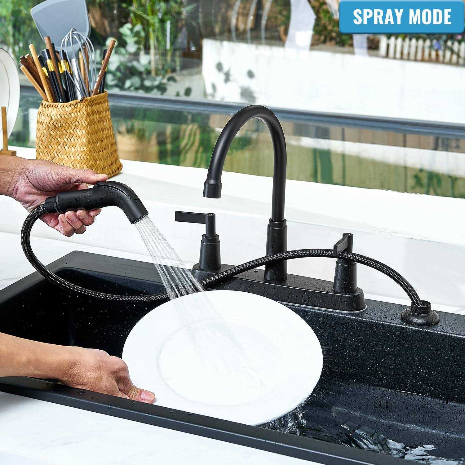 Two-Handle Design & High quality: Two-Handle Design is suitable for home sink or Granite Counter Tops. 500,000 open&close tests done on ceramic valve and faucet handle to provide professional drip-free durability performance. ABS Plastic side sprayer and 360 Degree Spout: Matching side spray provides flexibility and convenience for cleaning and food prep. High arch 360 degree swivel nozzle supply full range of washing for your kitchen sink. Overall height: 11.42″”; Spout Height: 7.48″”, Spout Reach: 7.28″”. Faucet will come with all the mouting hardware, 3/8″” H & C water hoses includ, you can diy your installation without a plumber to save money and time. Easy Cleaning and Installation: Premium multiple layer matte black coated kitchen faucet resists rust, corrosion, and tarnish. Designed to fit 3-hole, 8-inch configurations. Lifetime free replacement. Everything you need is provided, your cleaning need is fully considered.”