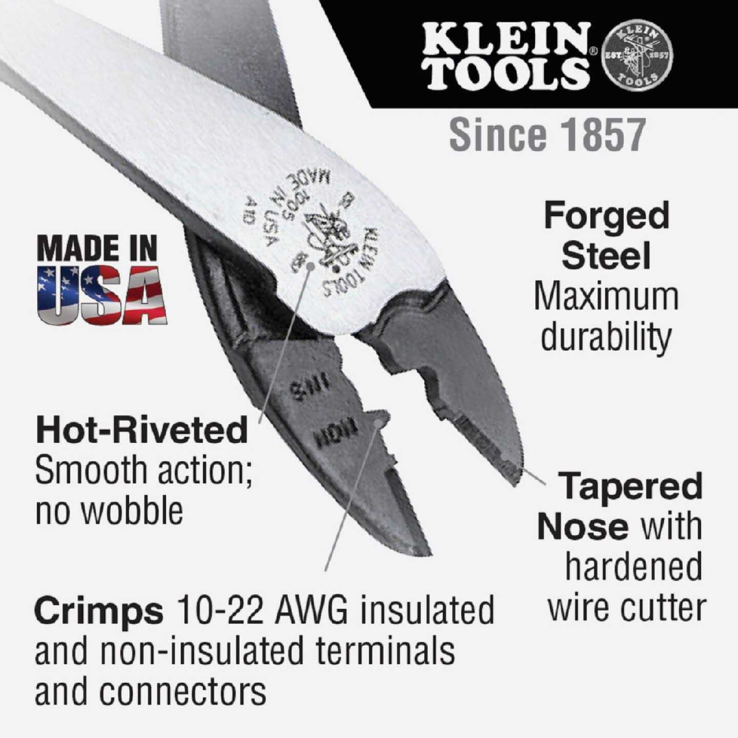 The Klein Tools Crimping and Cutting Tool is designed to work with both insulated and non-insulated terminals and connectors. It features a tapered nose which is ideal for working in tight spaces. It also has a specially hardened wire cutter in the nose of the tool.