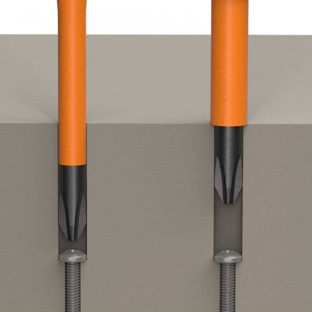Klein tools” flip-blade insulated screwdriver is two drivers in one tool. The auto-eject mechanism works with just a twist, allowing you to flip the #2 Phillips to the 1/4 in slotted end of the blade simply and easily. A bright orange coating of insulation protects from electrical shock, as well as being flame and impact-resistant. Klein insulated tools exceed the ASTM F1505 standards for insulated tools and are clearly marked with the official 1000 V rating symbol.