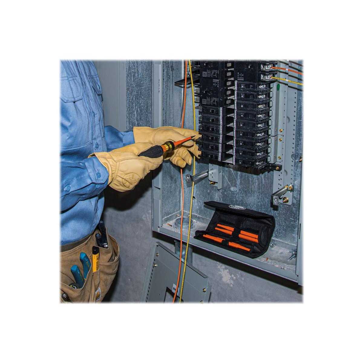 Klein Tools’Interchangeable Insulated Screwdriver Set includes an insulated handle and 5 interchangeable insulated blades for quick changes on the job. The auto-eject mechanism works with just a twist, allowing you to change or flip blades simply and easily. A bright orange coating of insulation protects from electrical shock, as well as being flame and impact resistant. Klein insulated tools exceed the ASTM F1505 standards for insulated tools, and are clearly marked with the official 1000-volt rating symbol. The set of five Phillips, Square and Slotted slim-tip blades come in a protective roll pouch, making this the perfect set for your tool bag.