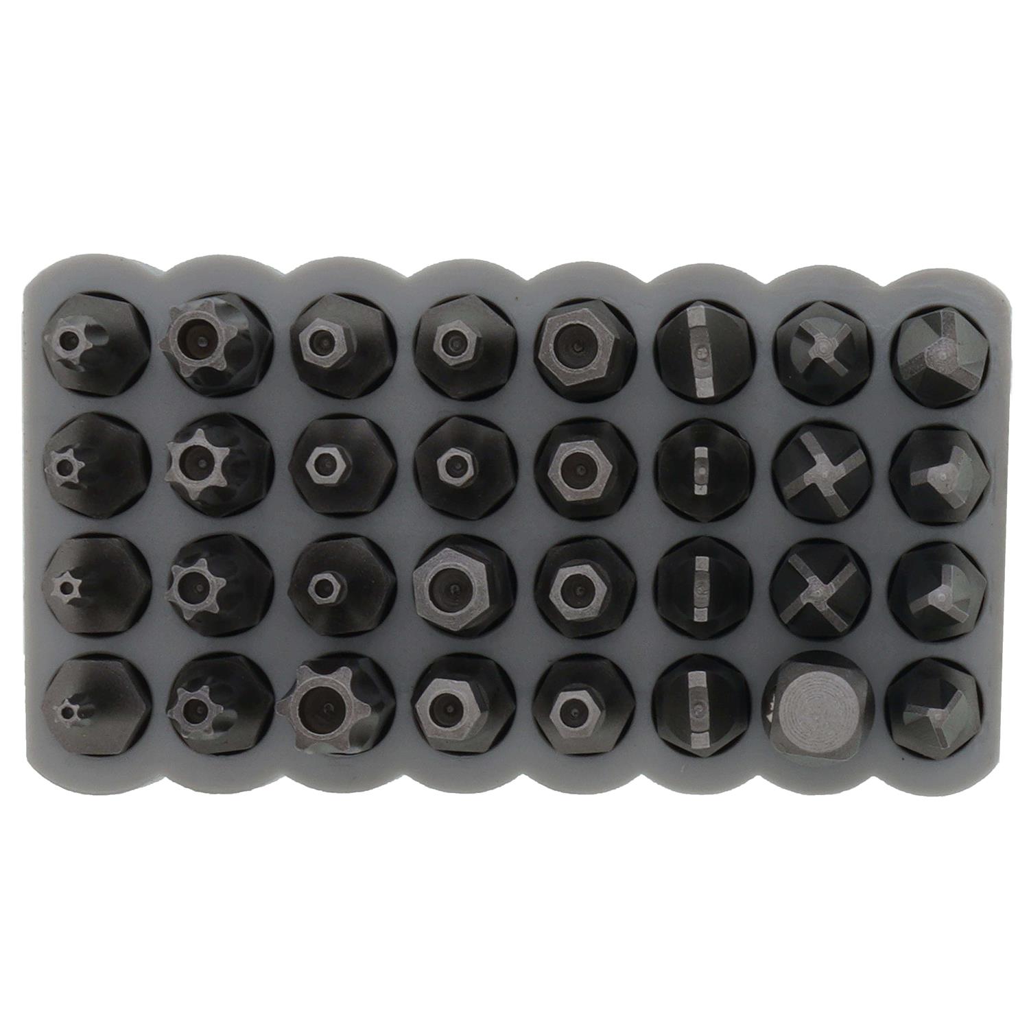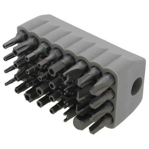This assortment of tamperproof magnetic screwdriver bits are precision-machined for exact fit. The steel is heat treated for long-lasting use. The durable PVC gray block allows for easy storage. The block slides over most screwdriver shafts for easy bit access. The bits meet or exceed applicable ASME / ANSI specifications.