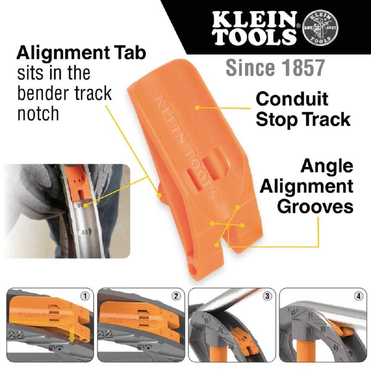 The wide foot pedal provides excellent stability and features angled grooves for extra traction. With easily visible bold cast-in benchmark symbols, degree scales and multiplier scales help save time on the job. 3/4-Inch assembled Aluminum Bender includes Klein’s unique Angle Setter technology for time-saving, repeated accurate bends; Patent pending Angle Setter for use on 10-, 22.5-, 30-, and 45-Degree bends (adjusted for conduit spring back). Easy handling aluminum head is reinforced for added strength. Bold cast markings and symbols make for fast, easy conduit alignment to make all bend types, including saddle and back-to-back bends. Wide foot pedal provides excellent stability, leverage, and comfort. Interior hook surface prevents conduit from rolling or twisting during bends. Includes markings for 10-Degrees, 22.5-Degrees, 30-Degrees, 45-Degrees, 60-Degrees and corresponding offset multipliers. No. 51612) creates a hard stop for quick, accurate, and consistent bends.