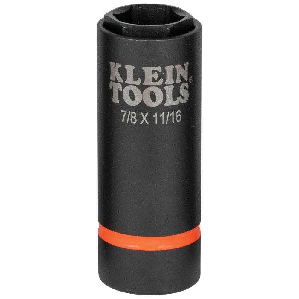 Klein 2-in-1 Impact Socket Set consisting of the commonly used impact socket sizes used in utility and construction work. Each impact socket features two coaxial spring-loaded sockets in one. The high-torque, 12-point design is easier to position on fasteners including square ones.